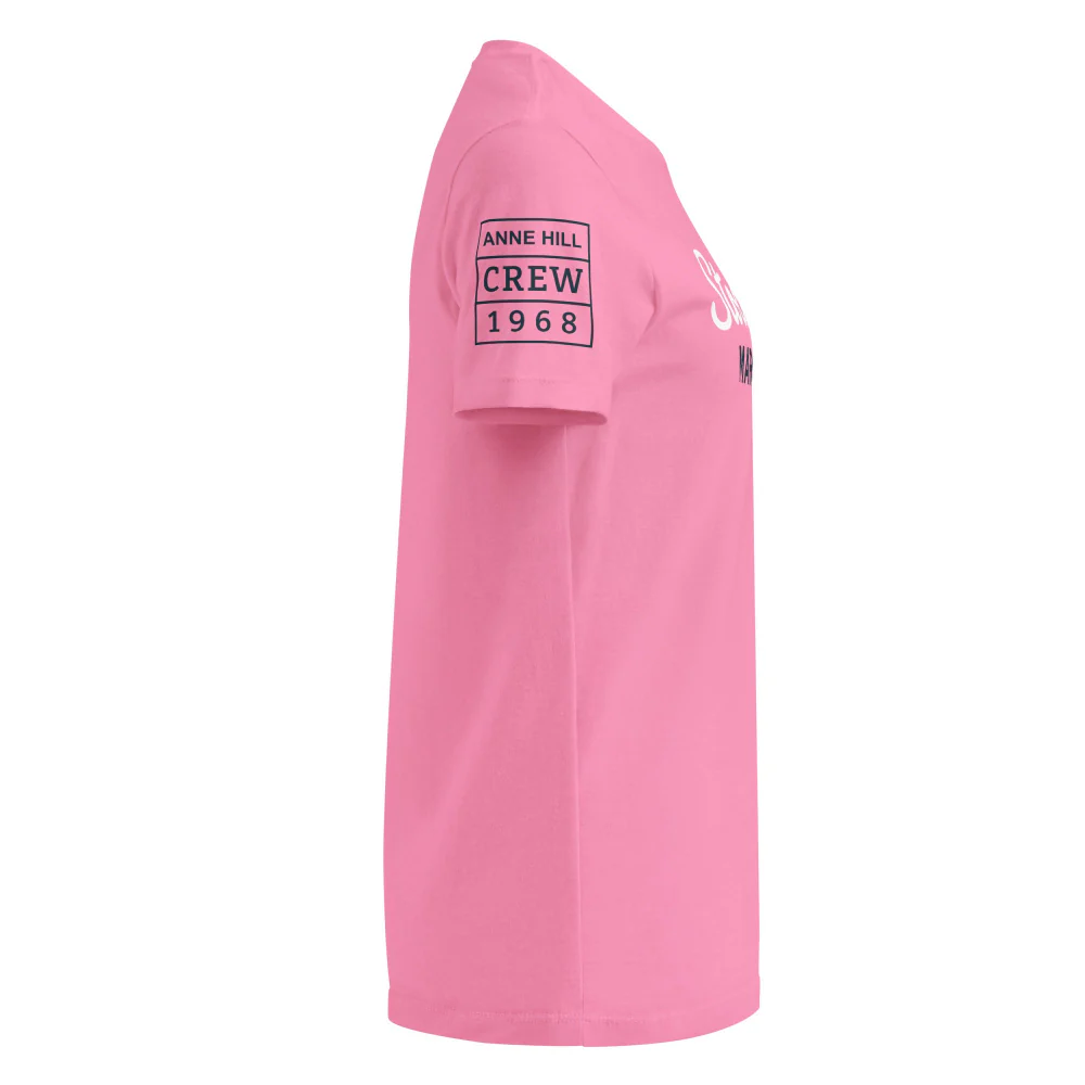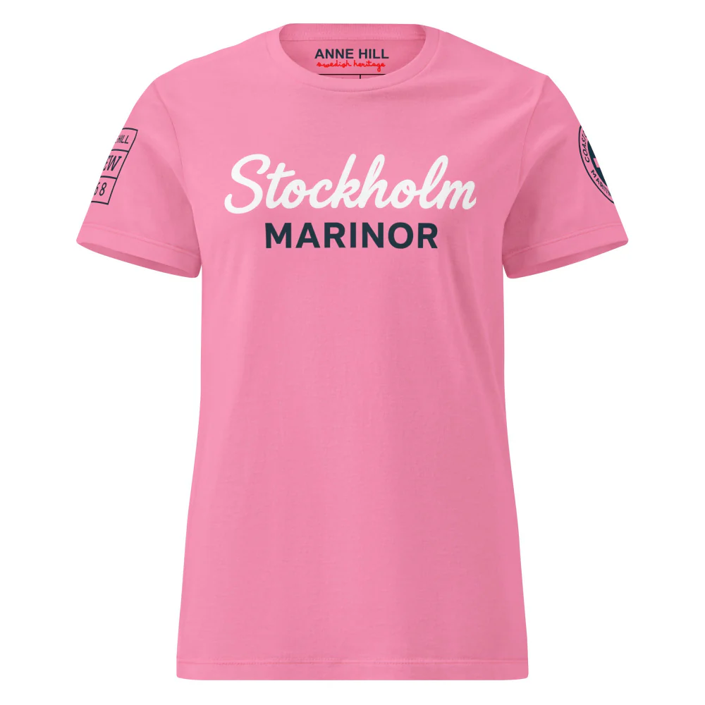 På bröstet finns trycket Stockholm Marinor i vitt och marinblått som ger ett fräscht, nautiskt uttryck. Ärmarna pryds av två emblem: Anne Hill Crew 1968 samt ett runt maritimt märke med kors och texten Coast of Sweden – Maritime World. En modern t-shirt med tydlig identitet och nordisk känsla.