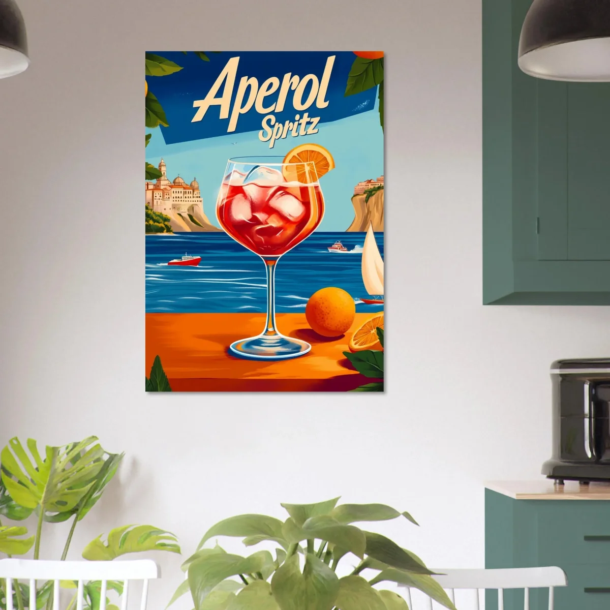 Upplev den sprudlande känslan av italiensk sommar med vår fantastiska ”Aperol Spritz” poster! Denna vackra illustration fångar essensen av den älskade cocktailen, med ett glas fyllt av den förföriska orangea färgen och isbitar som reflekterar solen. Bakgrunden med en storslagen kustlinje och segelbåtar i fjärran ger en känsla av avkoppling och fest.