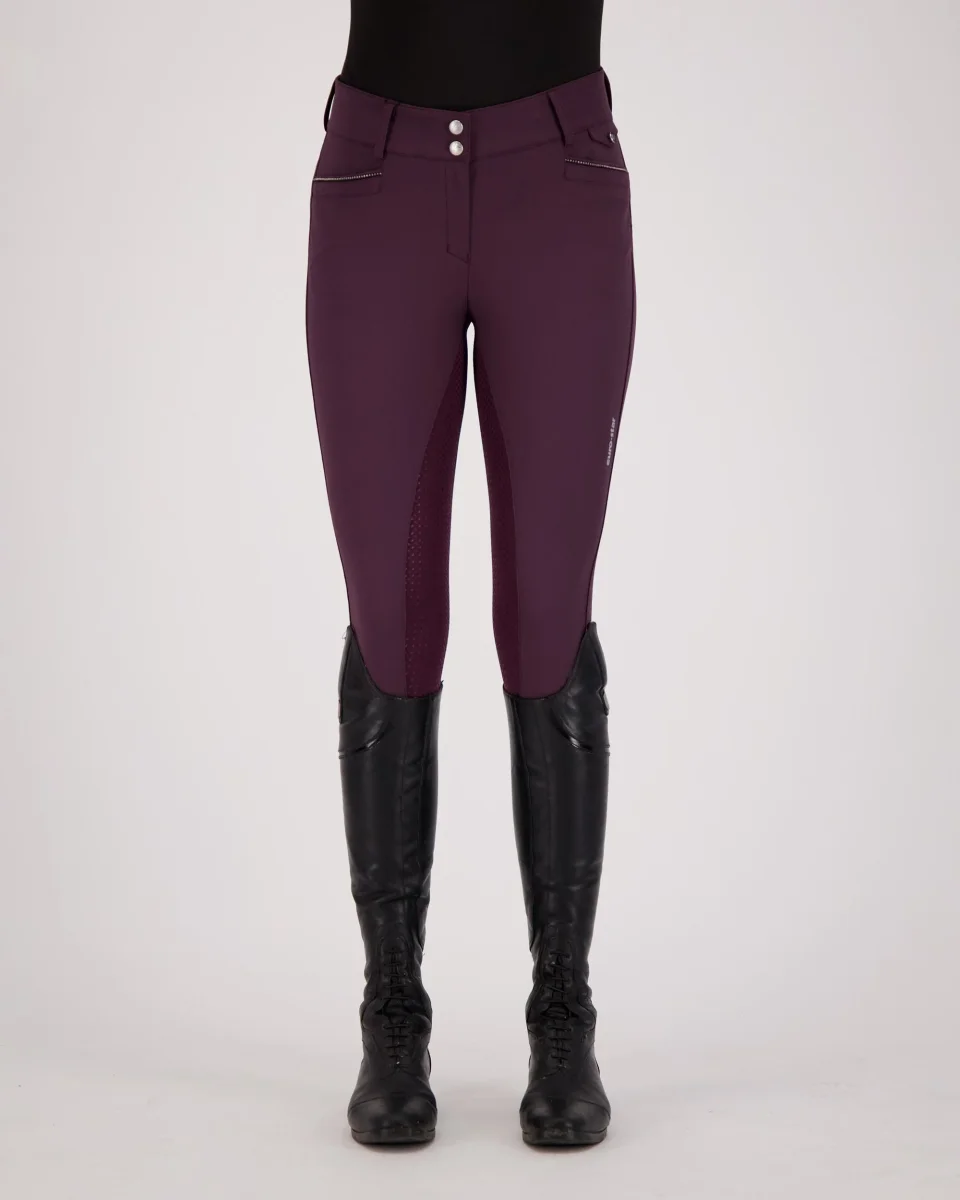 Skoningen är GripTec Full Grip, vilken ger ett mycket bra grepp i sadeln utan att begränsa ryttarens rörlighet. På framsidan är det två fickor där kanterna är dekorerade med pärlor med metall finish. Baktill finns två fickor med knappar.