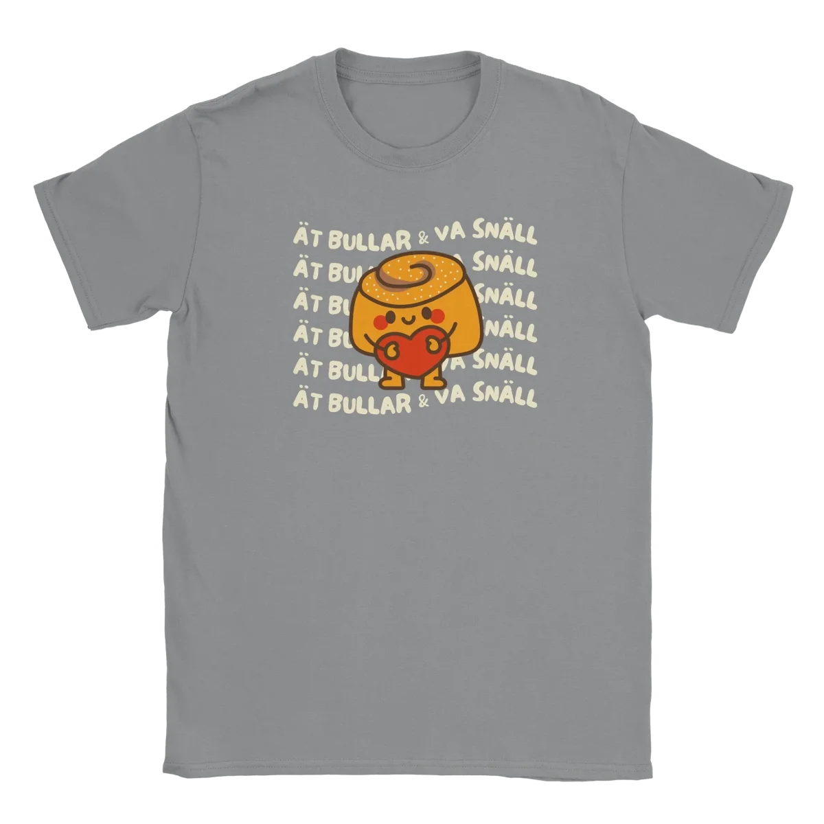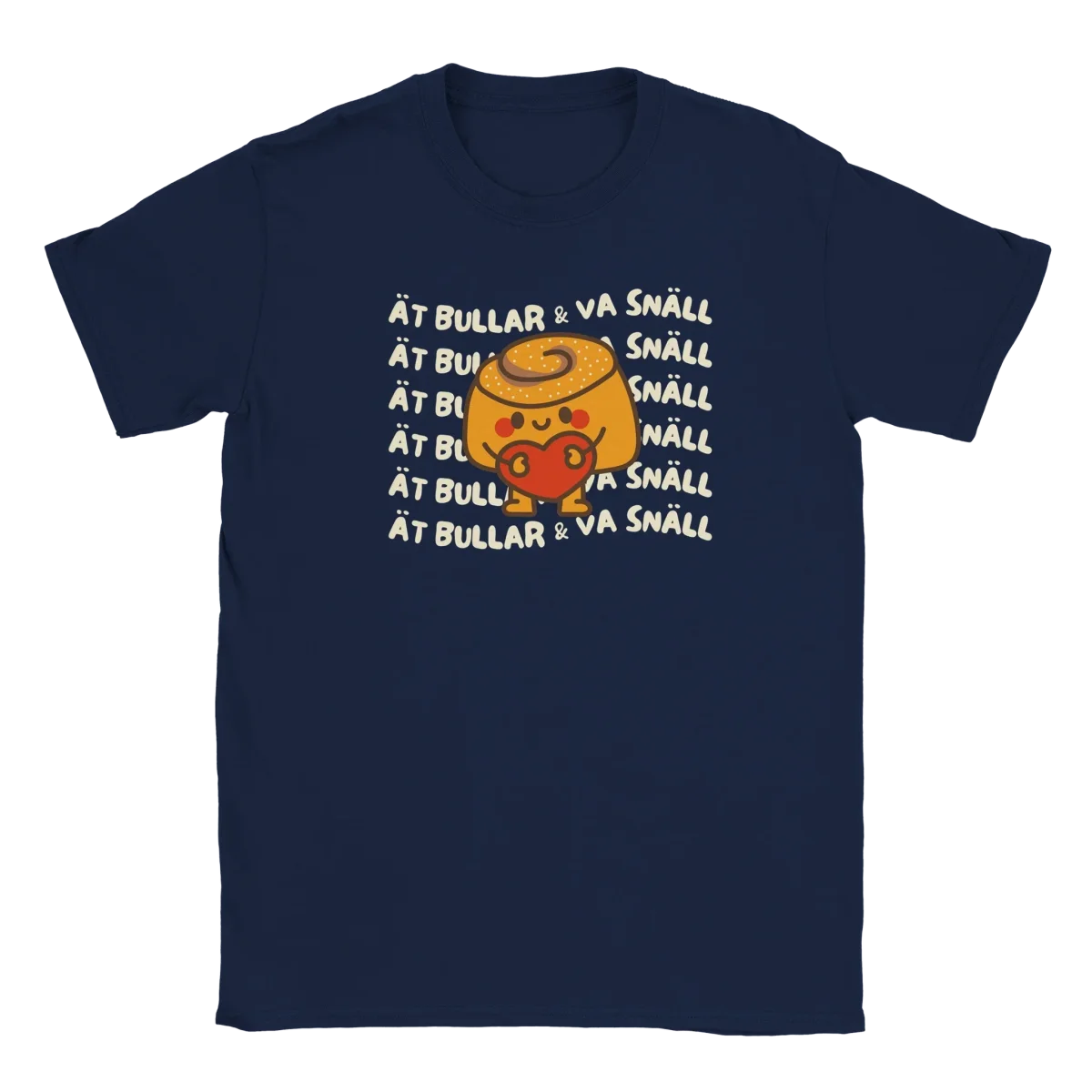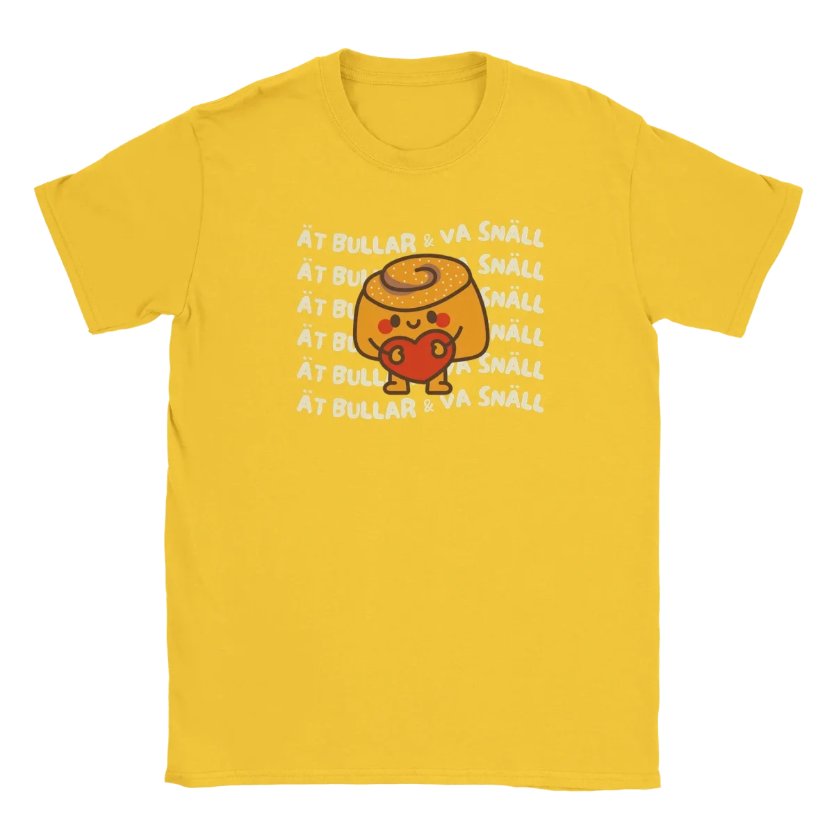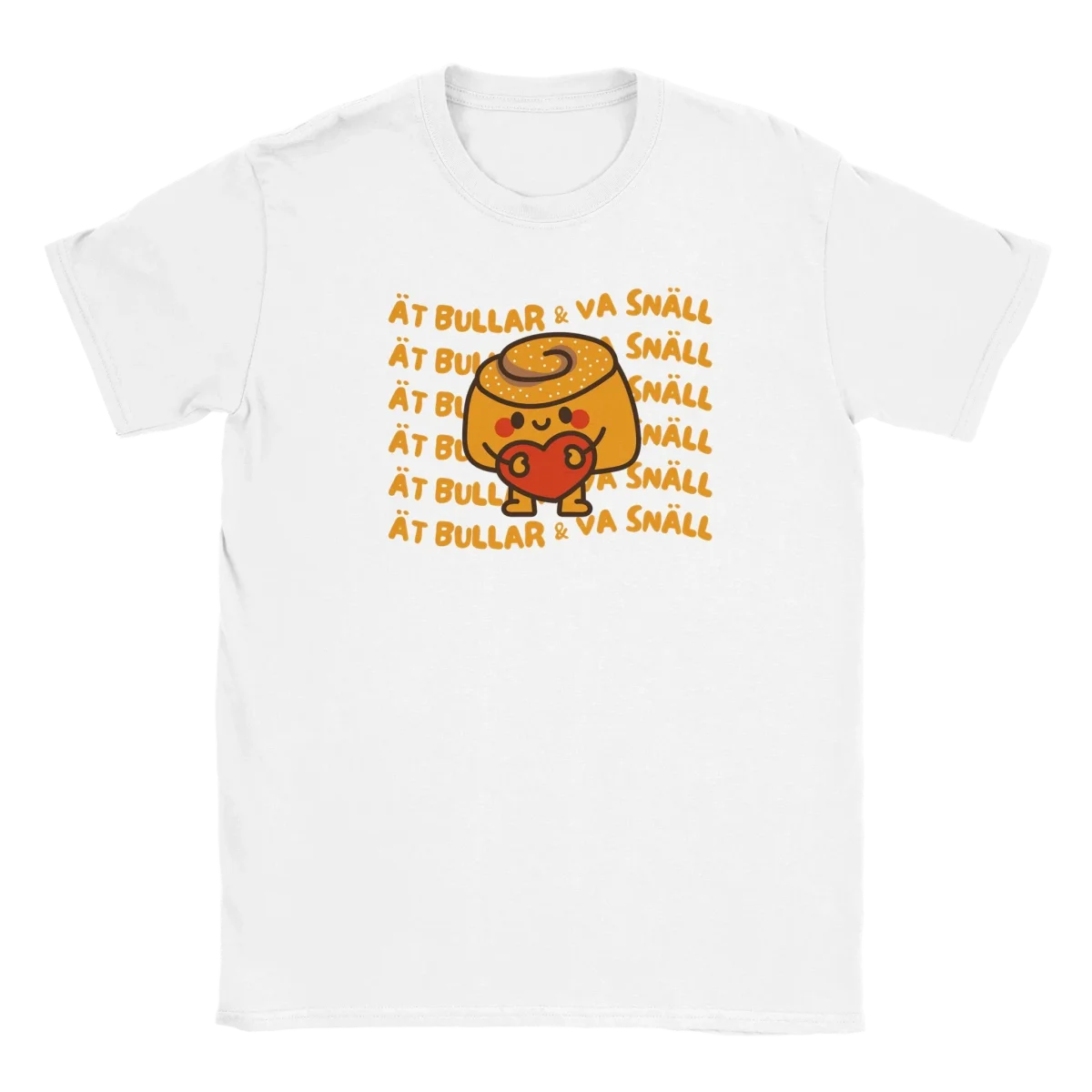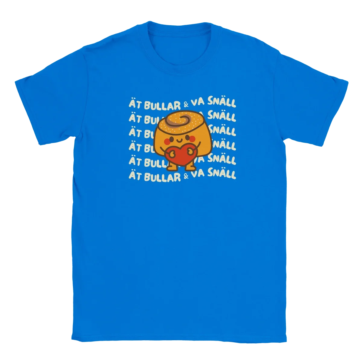 Hälsosam livsfilosofi, eller hur? Denna t-shirt är en påminnelse om att livet blir lite bättre med bullar och en snäll inställning. Detta är en perfekt tröja för alla som älskar fika och vill sprida lite extra värme och godhet. Bär den när du njuter av din favoritbulle eller på en mysig fikastund med vänner – och kom ihåg att vara snäll, precis som den här lilla bullen på tröjan!