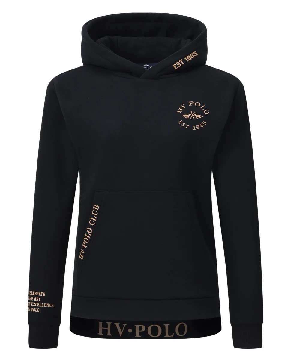 Mjuk hoodie med huva samt fickor framtill. HV Polo loggor och text på flera ställen.