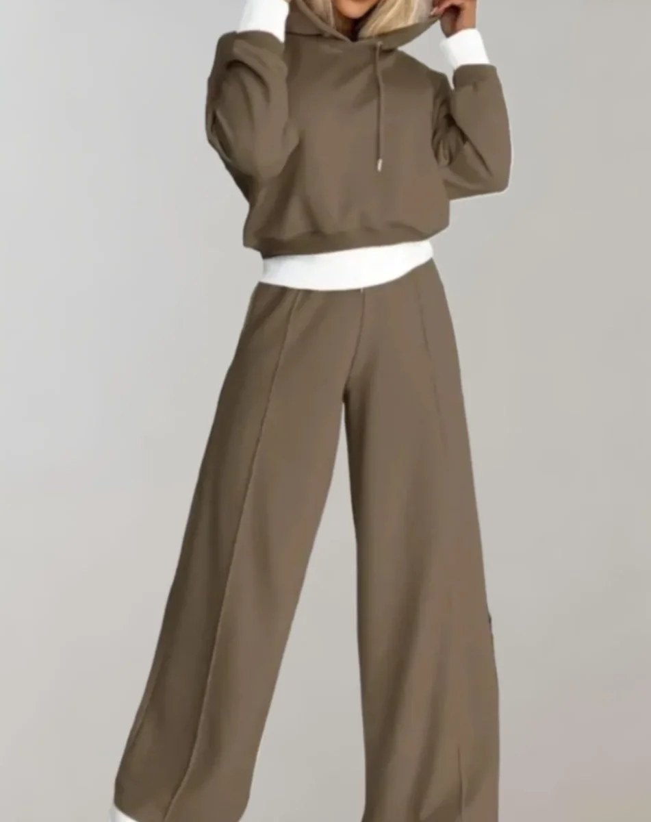 Upplev den perfekta balansen mellan stil och komfort med Cléo Tvådelat Set. Denna trendiga kombination av en hoodie och vida byxor erbjuder ett lätt och elegant utseende utan att kompromissa med bärkomforten.