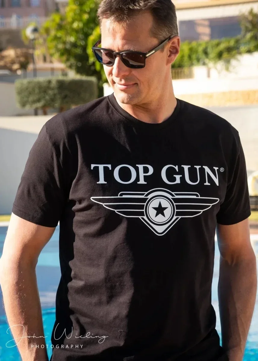Tröjan har en behagligt bred rund halsringning. Den sportiga passformen gör den mycket bekväm att bära. Den har den typiska Top Gun-texten framtill.