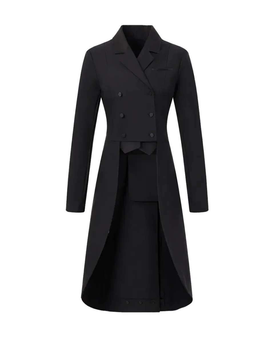 Fracken Helena, designad med stretchigt tyg för ultimat komfort och rörlighet. Denna eleganta frack har en satinkrage, avtagbara midjeflikar och en falsk bröstficka för extra stil. Midjedelen på baksidan ger en smickrande touch, medan de satin klädda knapparna och dubbelknäppning (dragkedja under) framtill ger en stilig look. Logga i strass på ärmen. Fracken har ett töjbart foder som ger en bekväm passform.