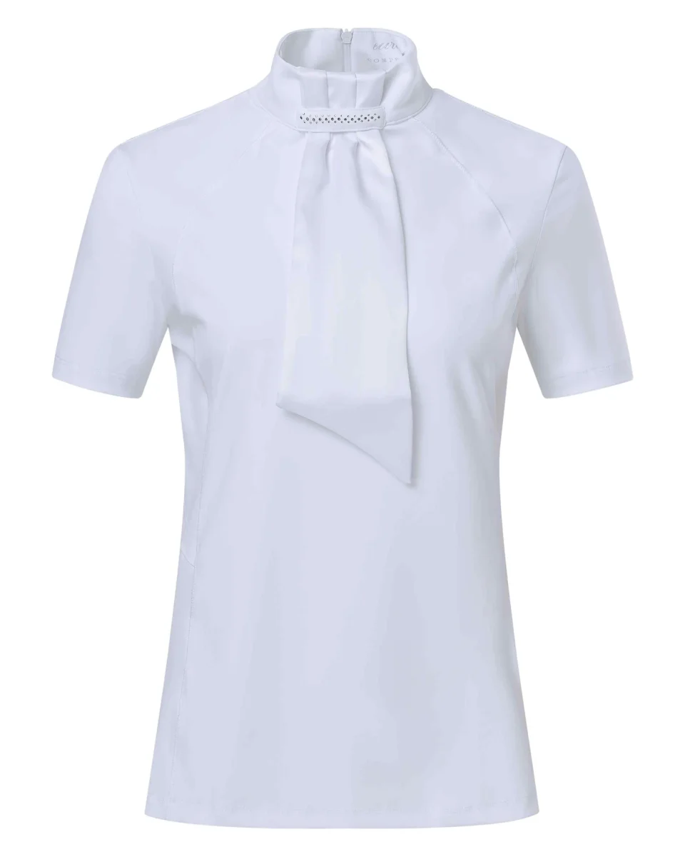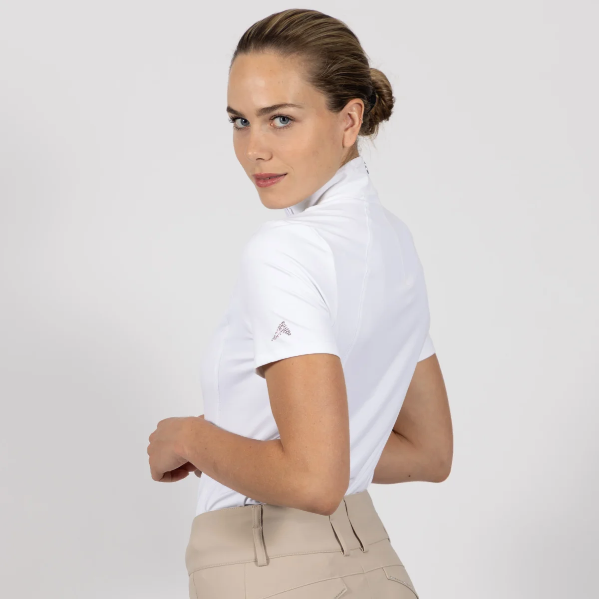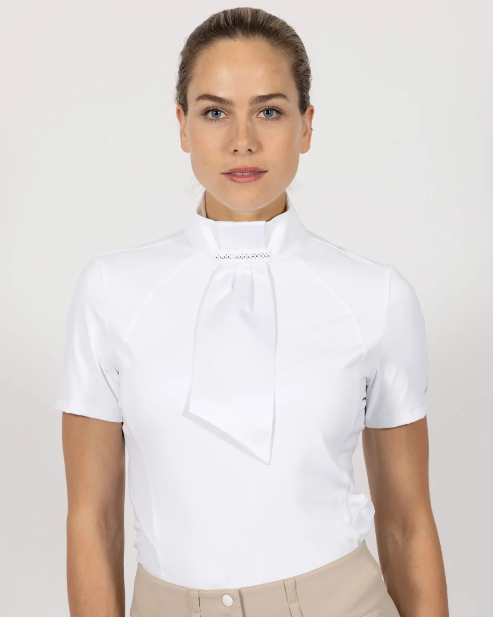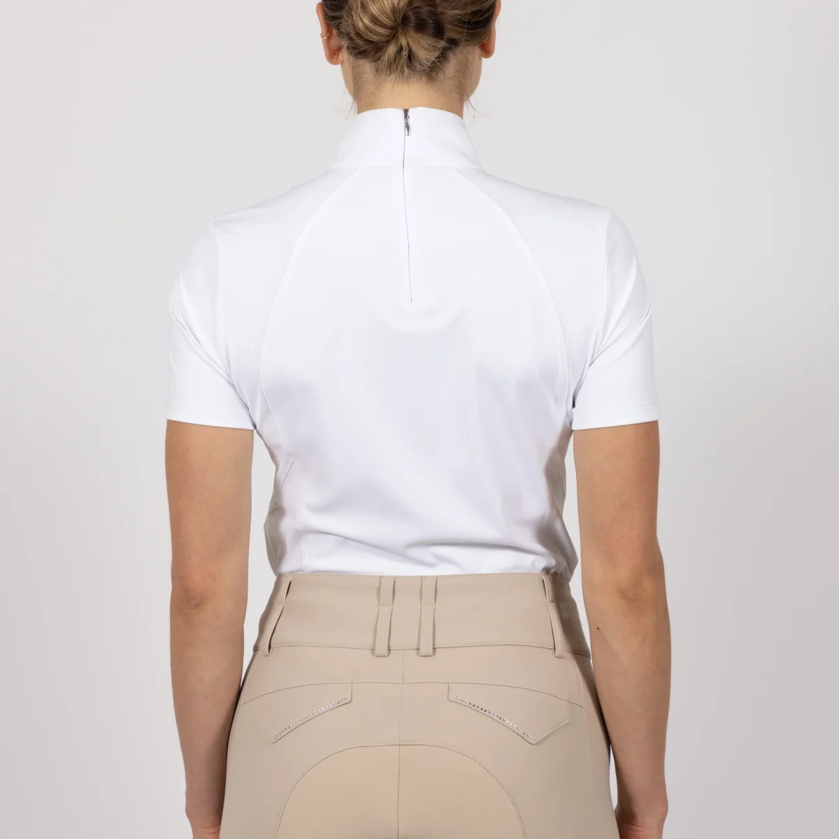Vit tävlingstopp med dekorerande plastrong. Materialet är stretchigt, ej noppande med UV-skydd.