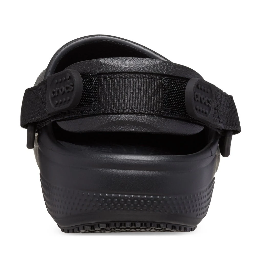 Crocs Classic Work Clog i svart är ett utmärkt val för dig som behöver pålitliga arbetsskor eller tofflor med hög komfort under hela dagen. Arbetstofflor framtagna för yrken inom exempelvis restaurang, hotell och vård, och kombinerar funktionell design med slitstarka material. Den halksäkra Crocs Lock™-sulan ger tryggt grepp på hala underlag, medan den justerbara hälremmen ser till att skon sitter stadigt på foten. Den stängda tån och det vattenavvisande övermaterialet skyddar effektivt mot spill och fukt.
