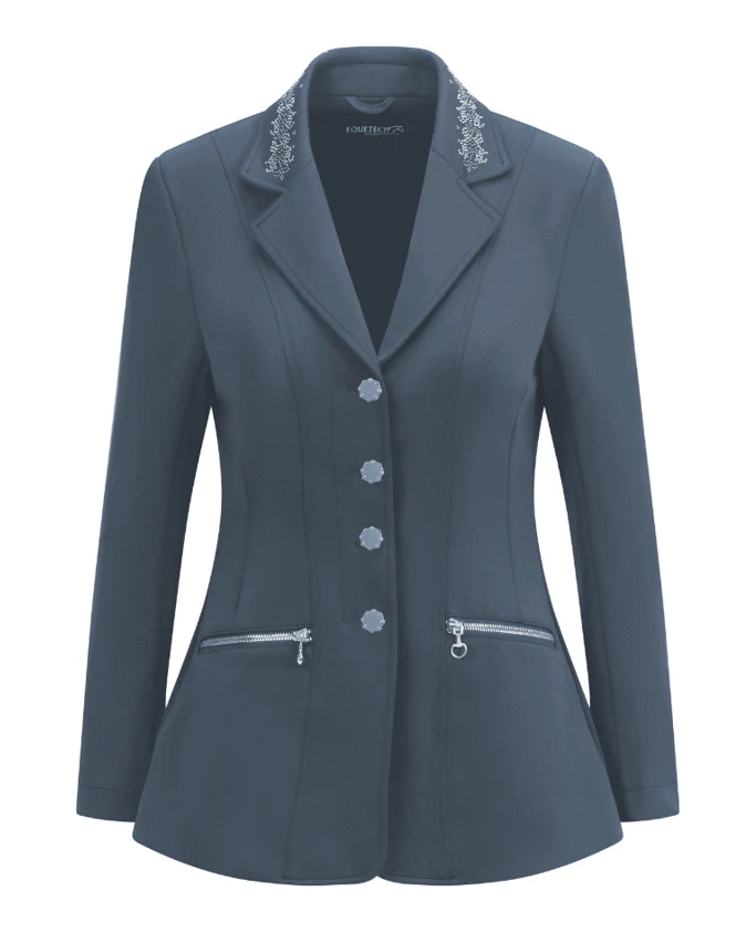 Crystal Showerproof Competition Jacket är en raffinerad blandning av stil, funktionalitet och prestanda perfekt för tävlingar. Kavajen är gjord av ett vattenavvisande stretchtyg i jersey, vilket säkerställer både komfort och skydd mot väder och vind. Dess stretchkvalitet ger utmärkt rörelsefrihet, vilket är viktigt under ridning. Det som utmärker denna jacka är dess utsökta detaljer. Utsmyckningen med kristaller på kragen tillför en touch av elegans och sofistikering.