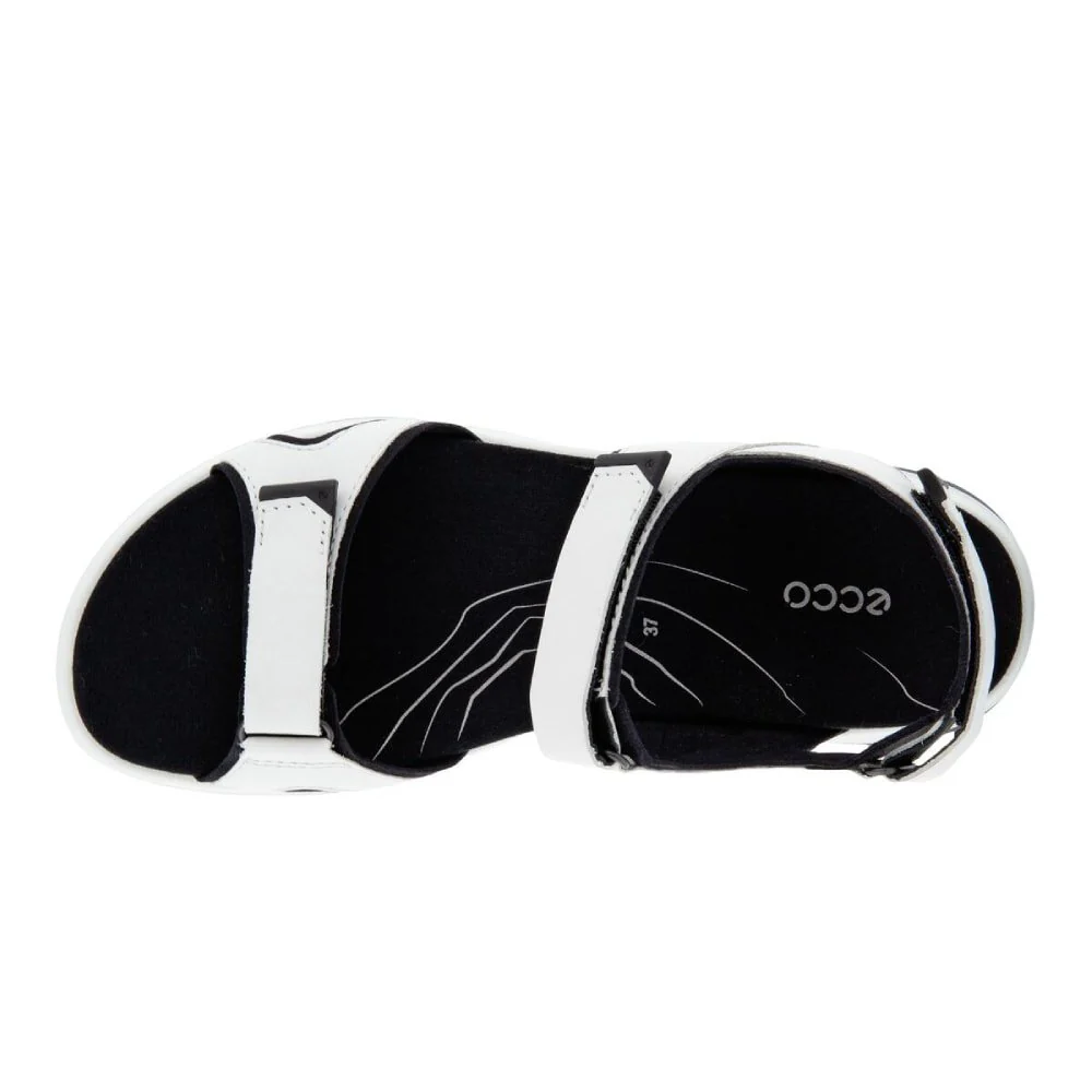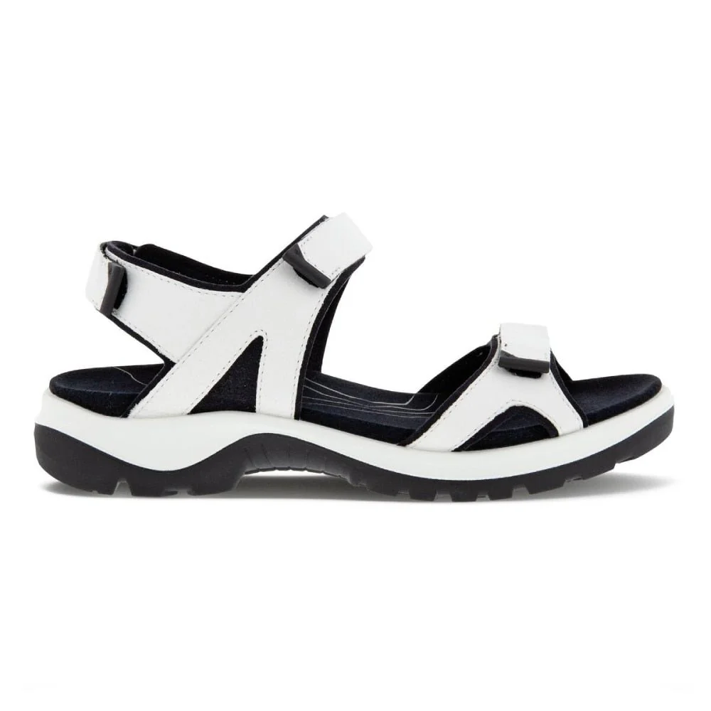 Ecco Offroad vita sandaler för dam med tre reglerbara remmar och stötdämpande fotbädd FLUIDFORM™. Ovandel i slitstark bubuckläder med mjukt foder i neopren närmast foten.