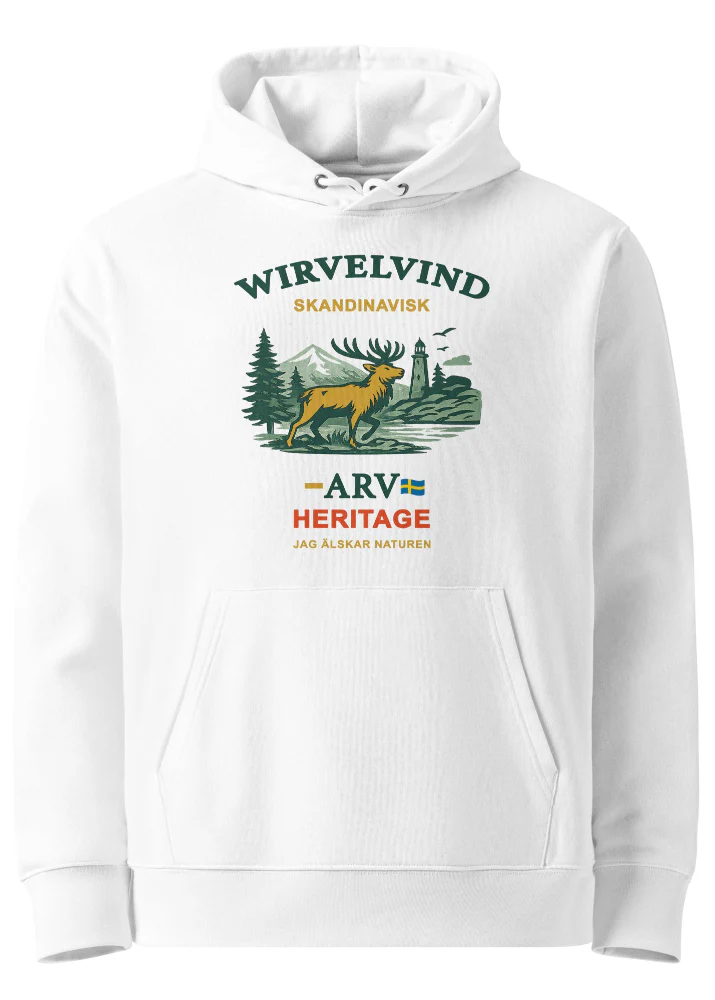 Mjuk och stilren ekologisk hoodie i vitt, tillverkad av 100 % ekologisk bomull och prydd med Wirvelvinds nordiska tryck “Skandinavisk Arv”. En bekväm och hållbar hoodie med rötter i nordisk natur, hantverk och frihet – perfekt för vardag, lager-på-lager och lugna äventyr året runt.