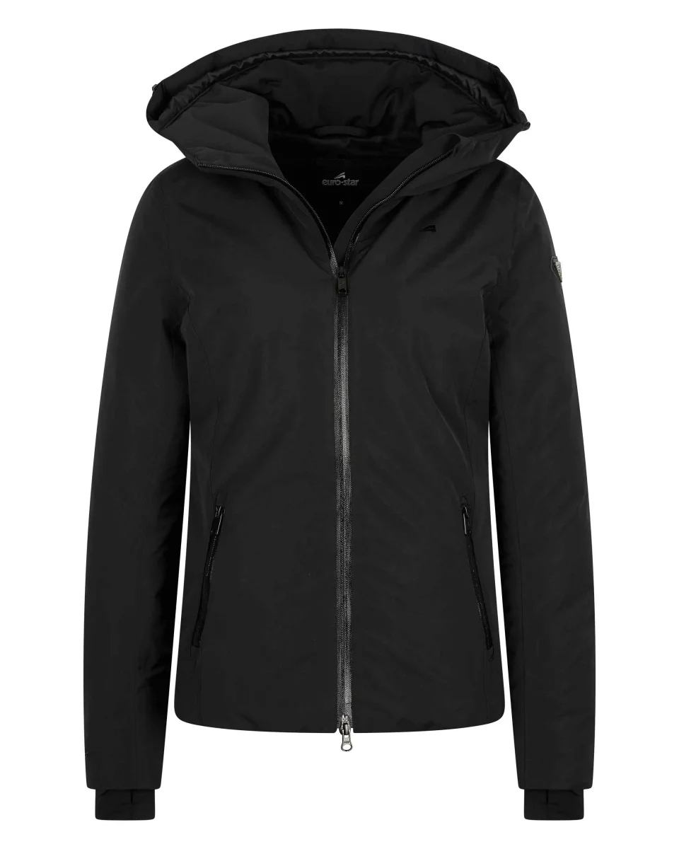 Feminin, vattenavvisande jacka med luva. Två-vägs dragkedja framtill. Jackan har två fickor med dragkedja och Euro-star-logga på vänster bröst. Jackan är vattenavvisande och andas.
