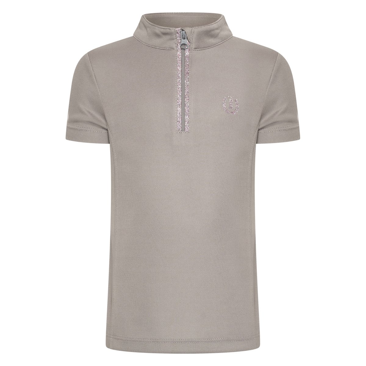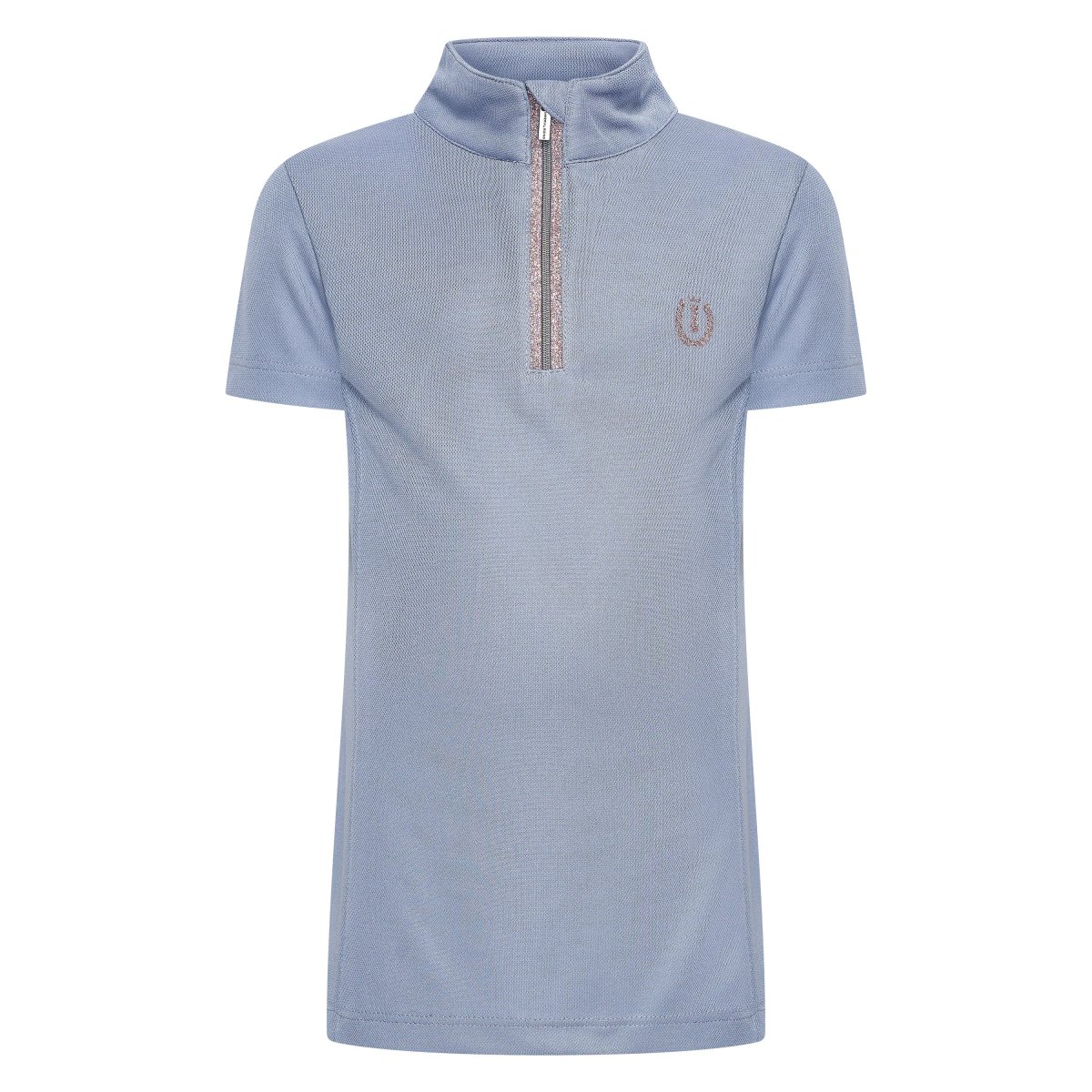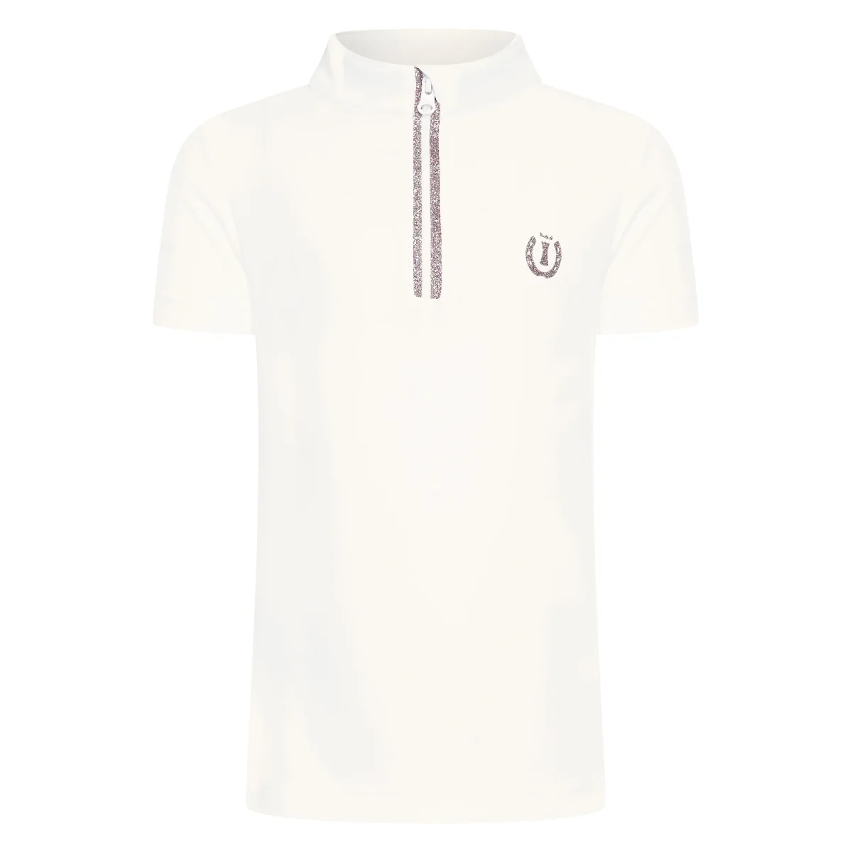 Kortärmad t-shirt tillverkad av fint pikétyg. Modern krage och en snygg halv dragkedja. Dragkedjan är täckt med skimrande glitter, vilket ger din outfit en touch av glamour.