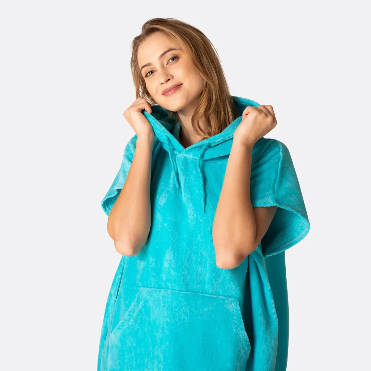 Ponchon har en stor huva och smarta öppningar på sidan som gör det lätt att ta på och av badkläder under!