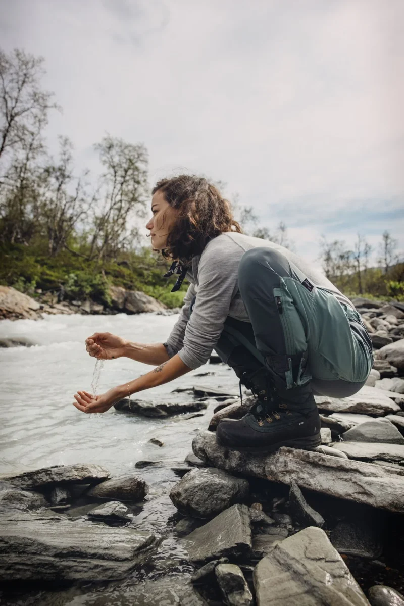 Huvudtyget i Makke Pant, Lundhags Polyester Cotton, är en blandning av ekologisk bomull och återvunnen polyester. Stretchpaneler i Schoeller Dryskin Softshell skyddar mot revor från grenar, nötning från stenar och allmänt slitage. Schoeller Keprotec-förstärkningar i vristen ger optimerad slitstyrka. Ventilationsdragkedjor på insidan av vristen, i handfickorna och längs utsidan av byxbenen. Makke Pant finns i storlekarna Short, Regular och Long.