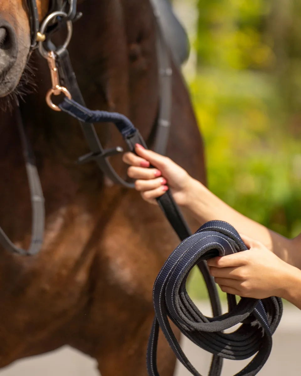 Mjuk longerlina med flexande inlägg vid hake och änden. Ytan är klädd med fleece, vilket gör den mjuk samtidigt som den går att använda utan handskar.
