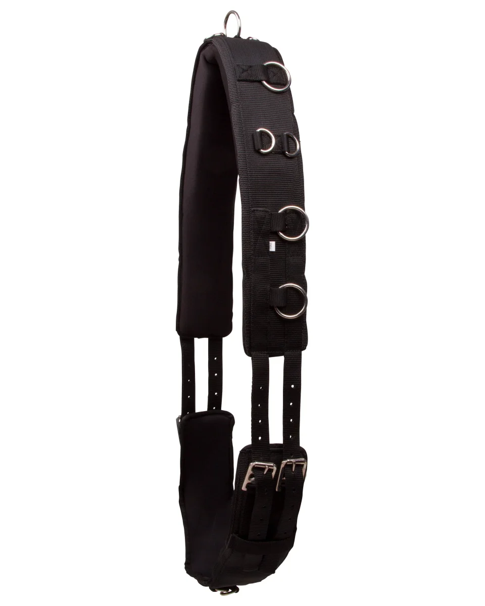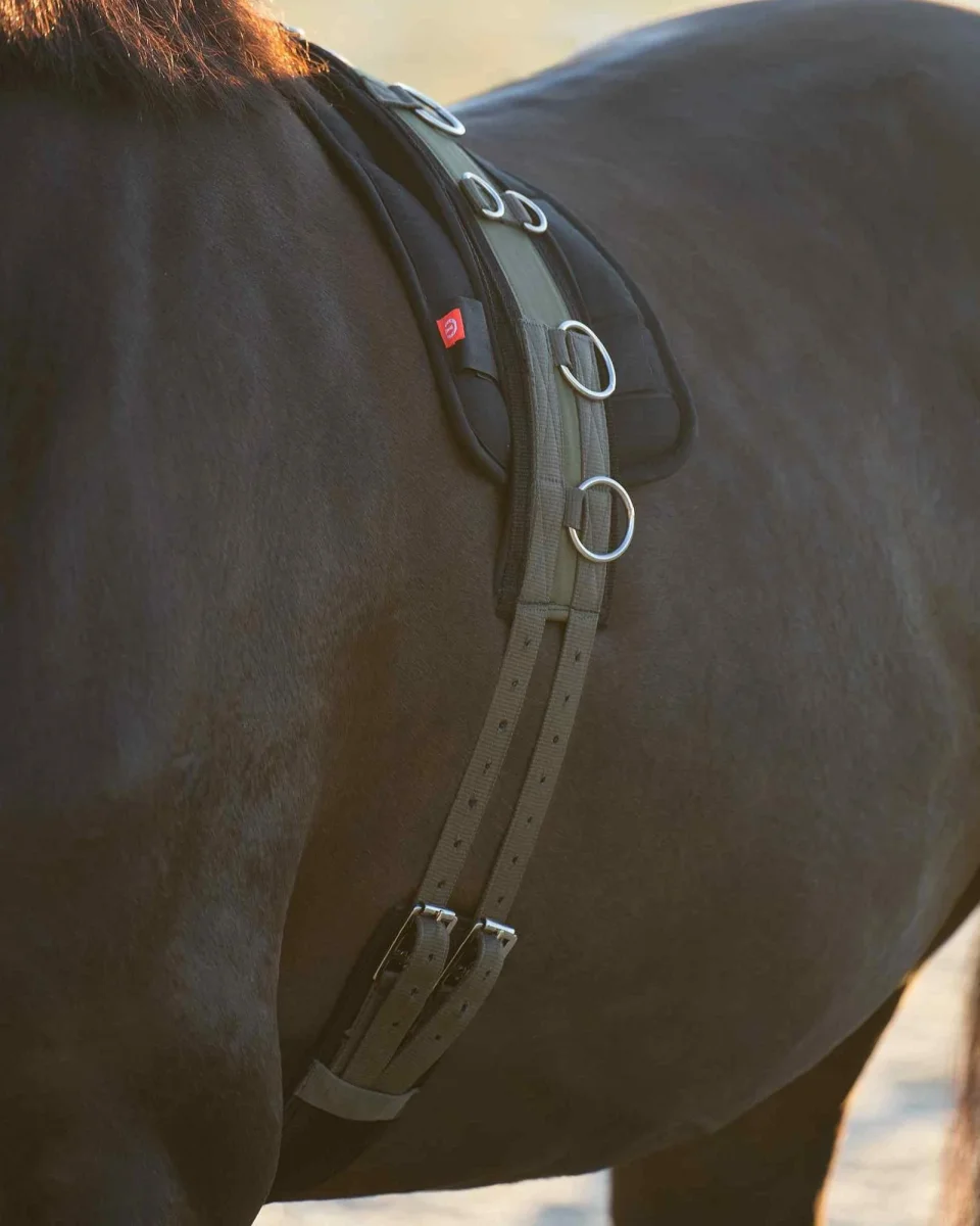 Longergjord i nylon med vaddering i neopren på insidan. Flertal ringar att trä longerlinan/tömmarna genom beroende på övning.