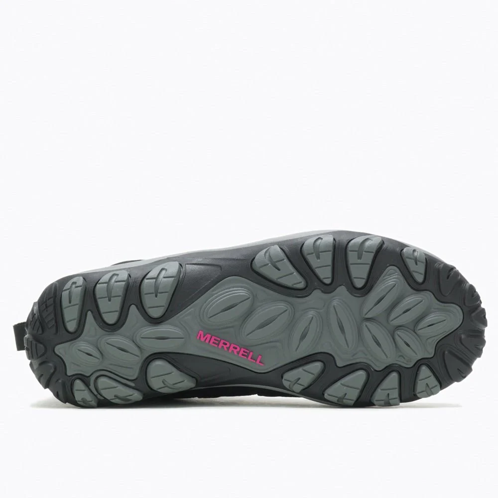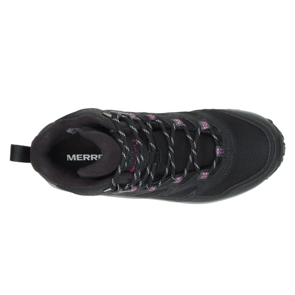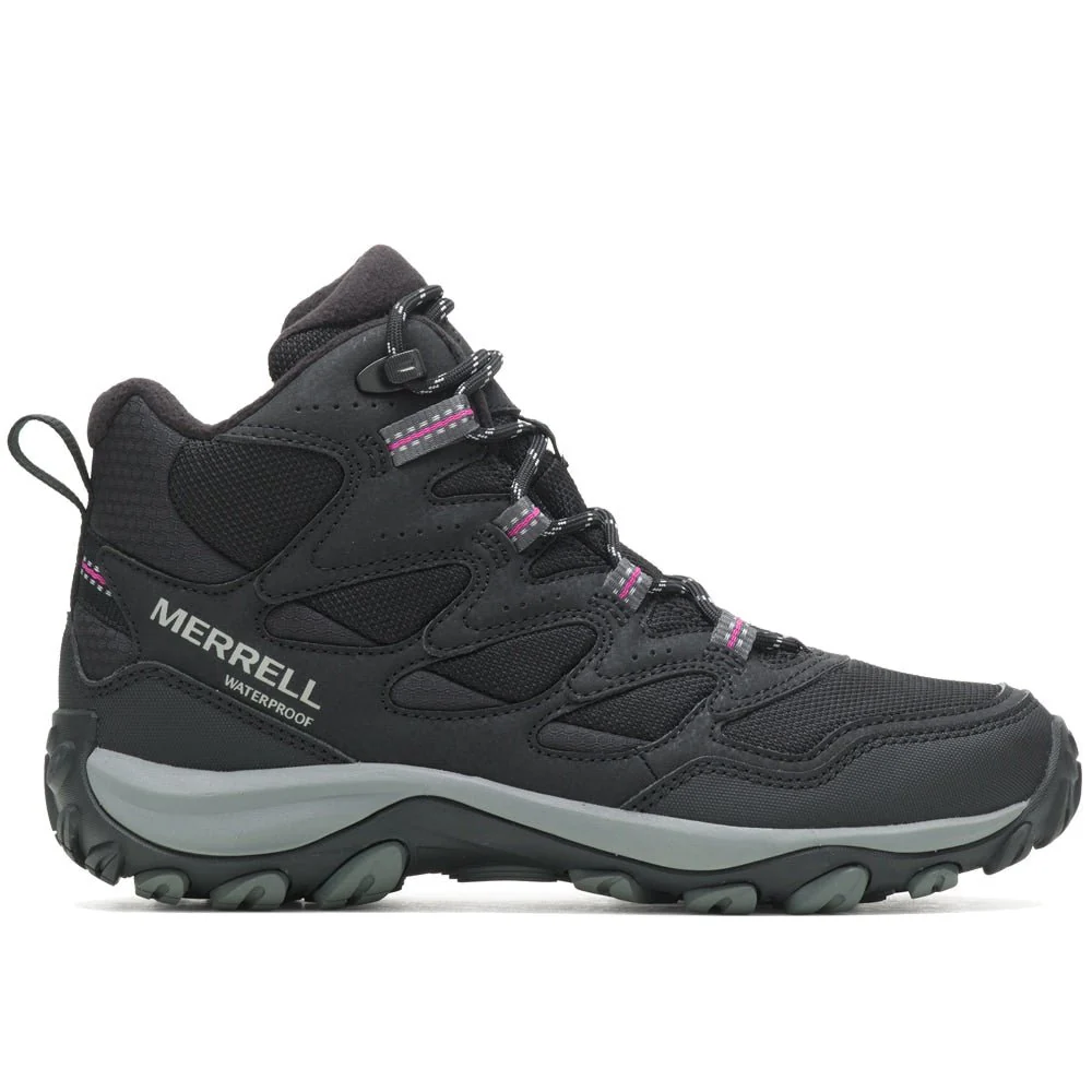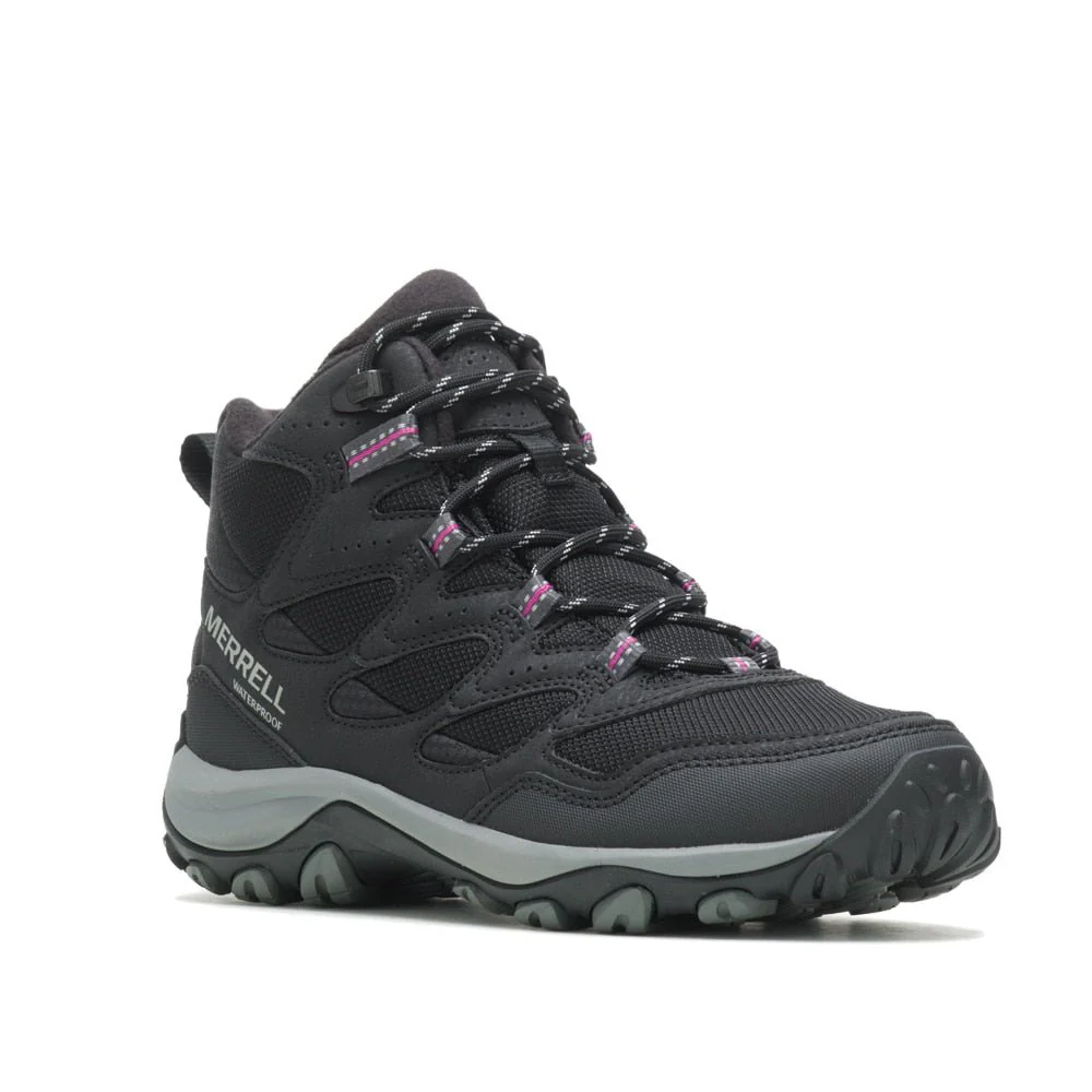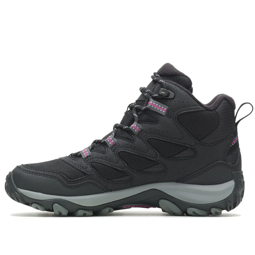 Merrell West Rim Sport Thermo Mid för dam är fodrade och vattentäta skor för vinterpromenader. Ett 200 grams lättviktsfoder med yta av fleece håller värmen. Bekväma och praktiska skor med inbyggd Merrell Air Cushion i hälen som ger dämpning vid hälsmärta samt ökad stabilitet. Ovandel i slitstark nylonmesh och skinnimitation. Den bälgsydda plösen håller skräp och snö borta från insidan.
