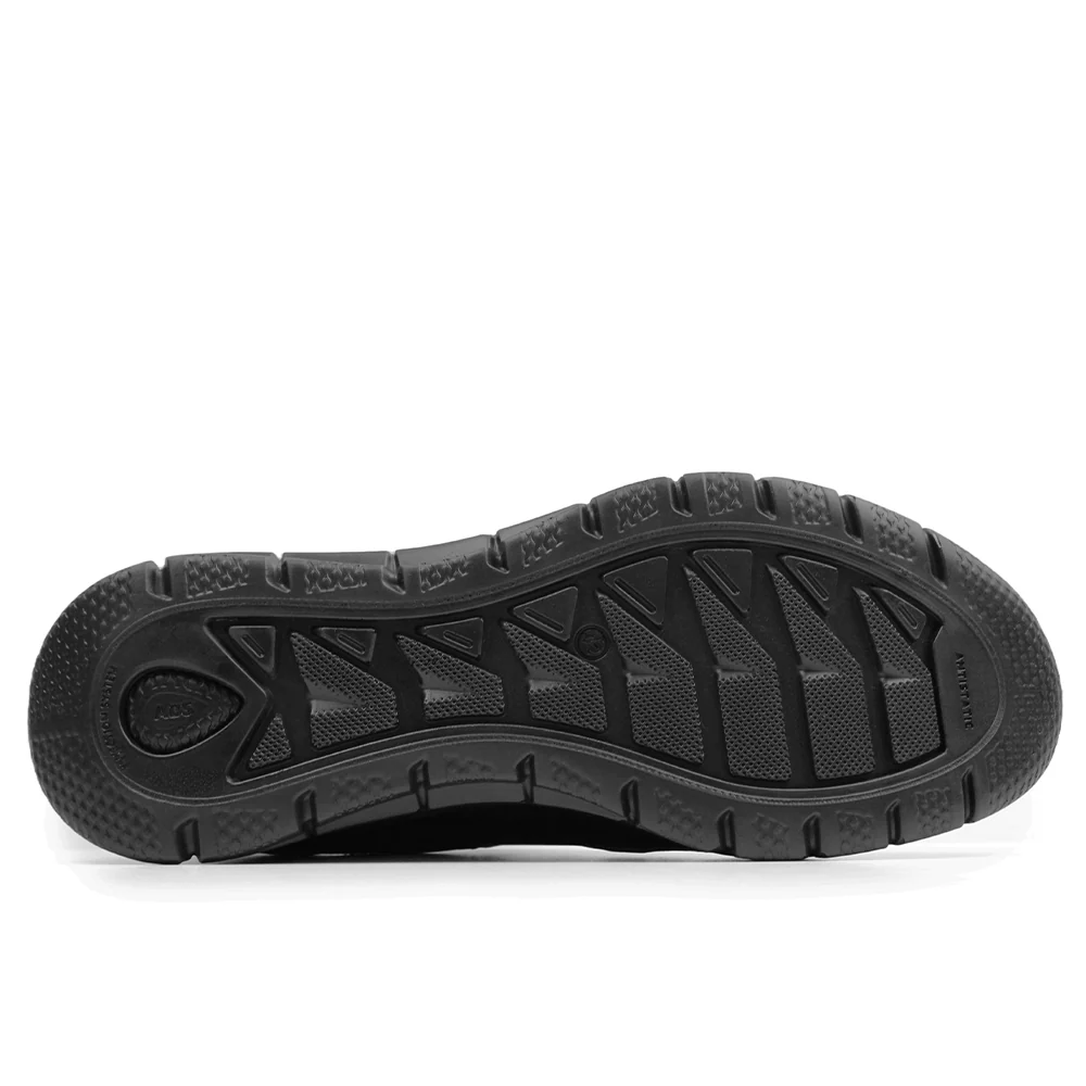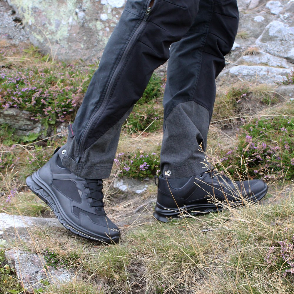 Skor helt i svart läder med mjuk fotbädd och hålfotsstöd, yttersula av Monodensity PU, lätt och slittålig.