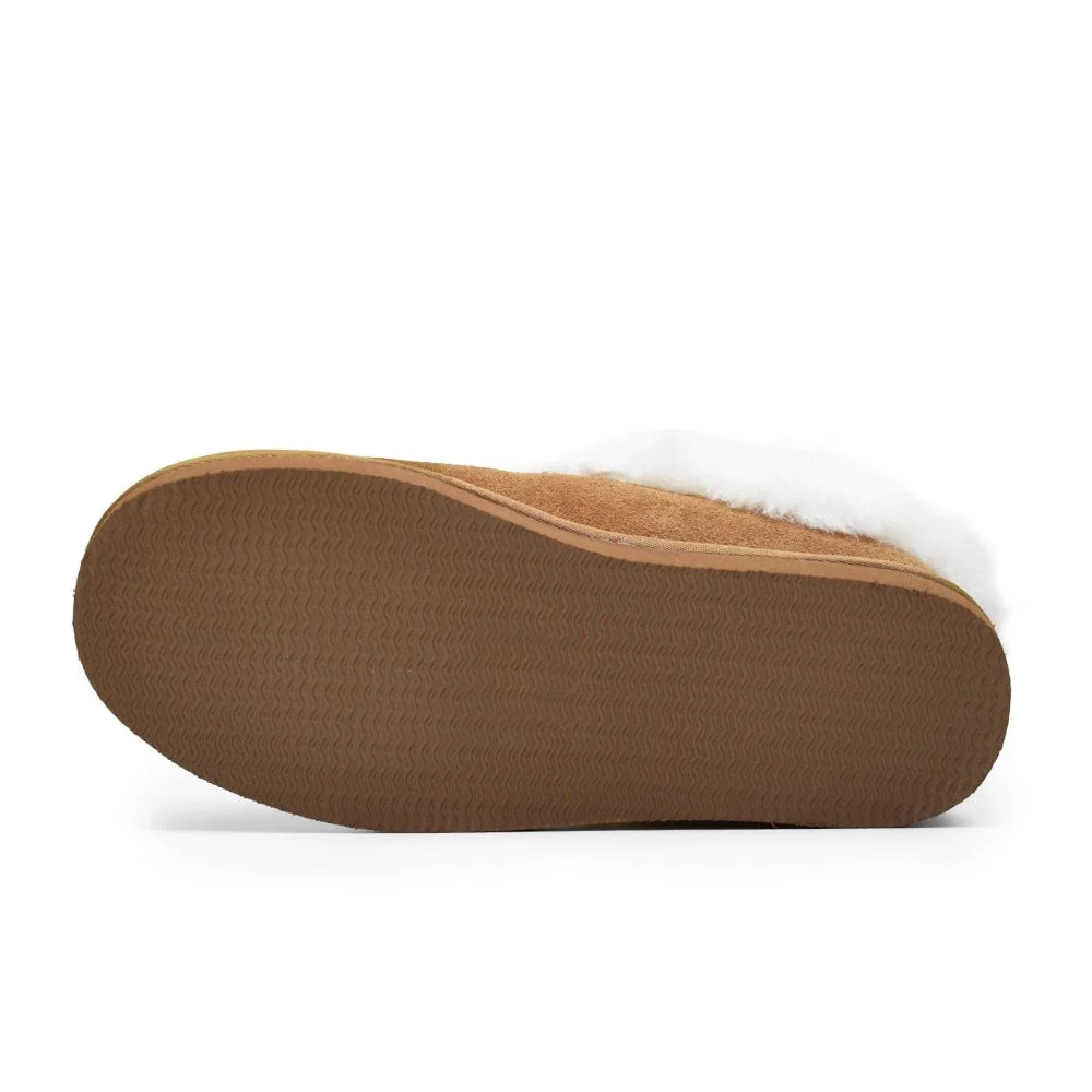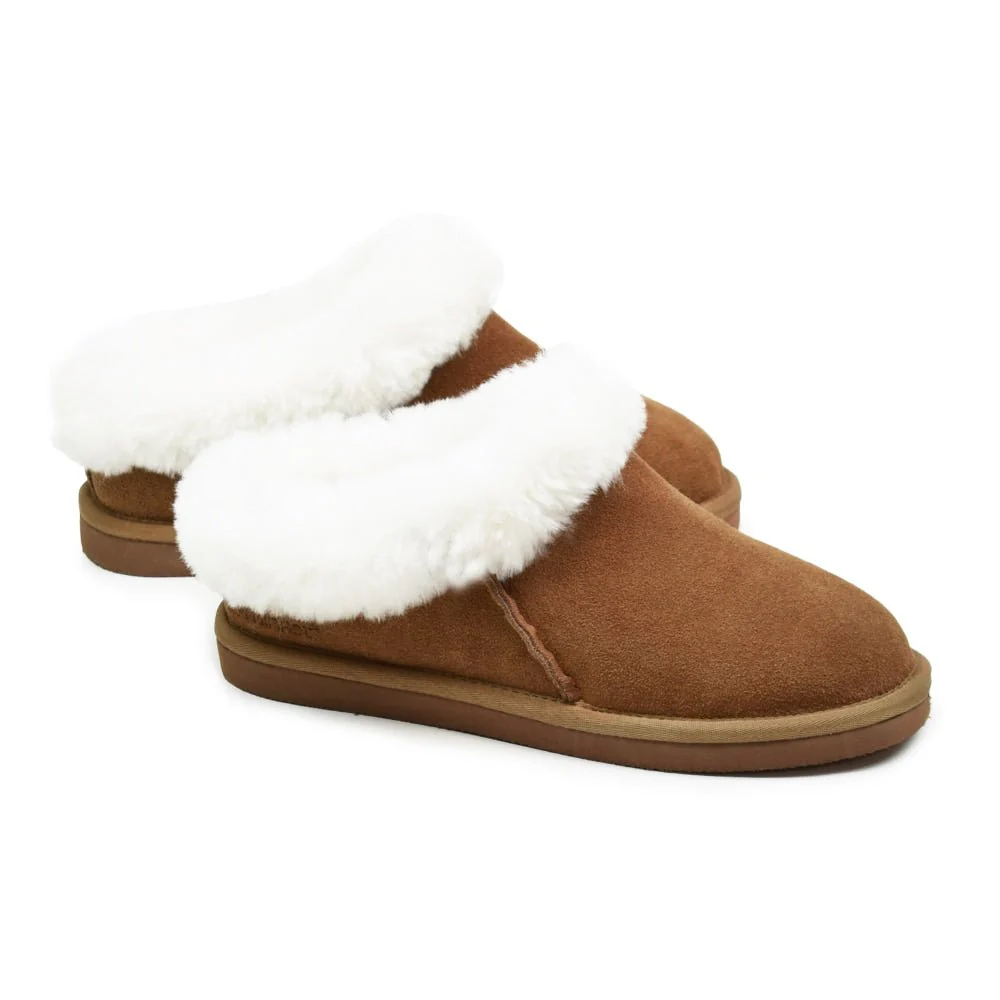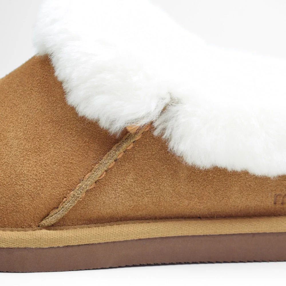 Ovandel av mocka, foder av fårskinn och yttersula som ger bra grepp, snygg design med en kort hälkappa gör dessa till snygga och bekväma innetofflor.