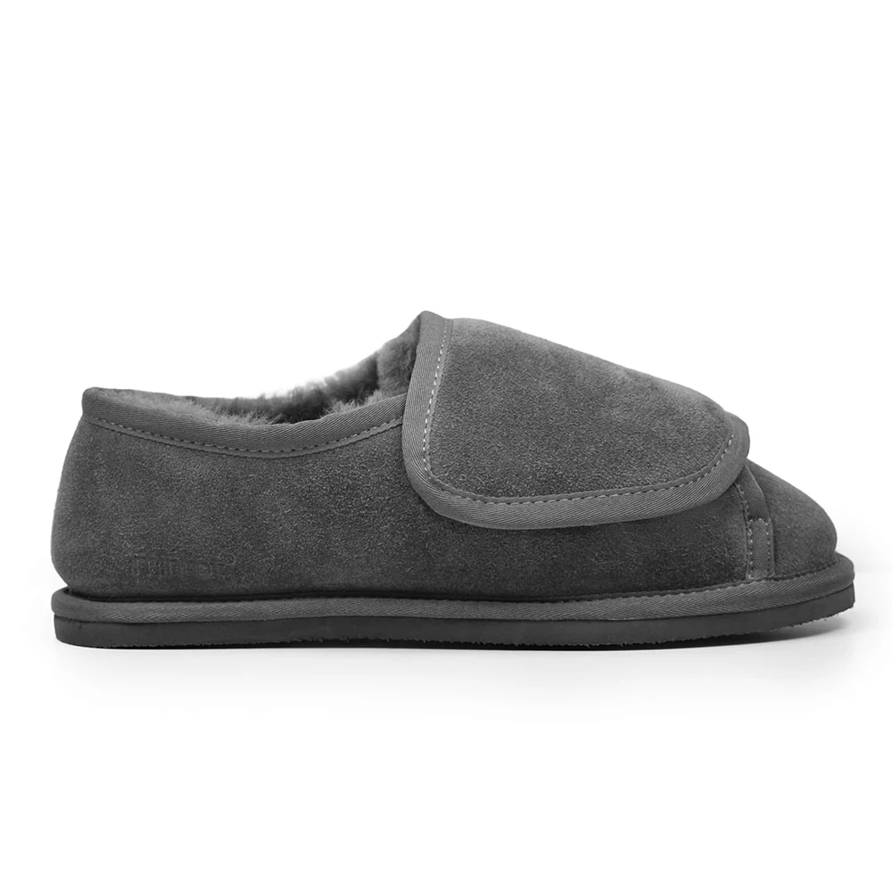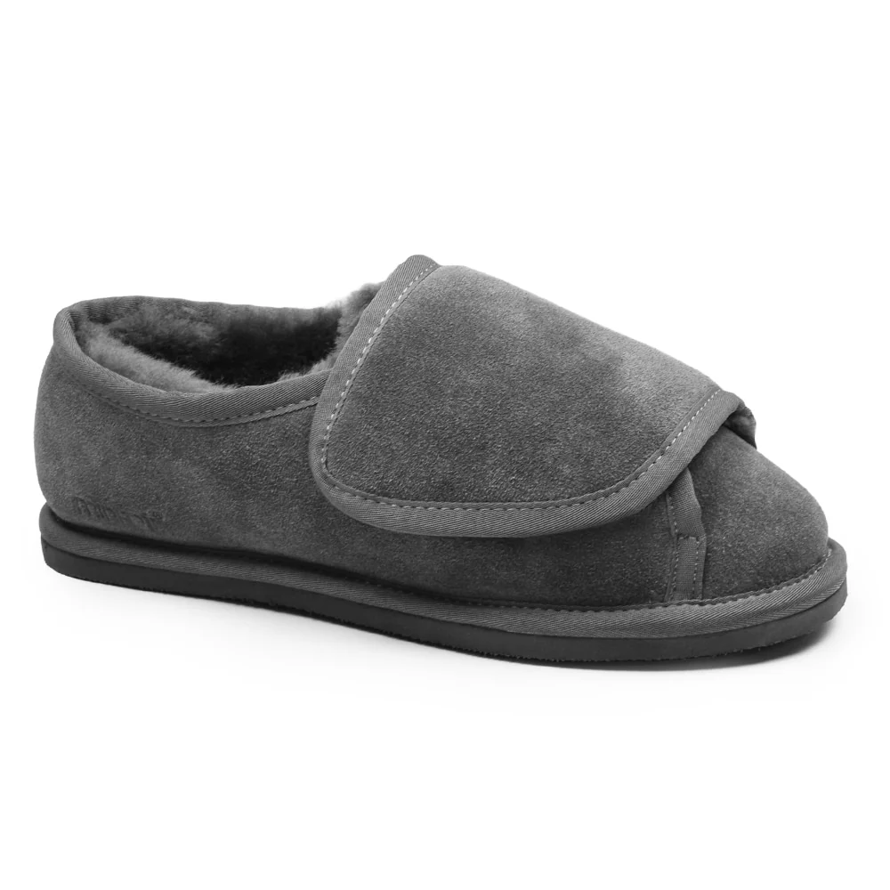 Varma tofflor med stängd tå och hälkappa, kardborreknäppning och mjukt foder av äkta fårskinn.