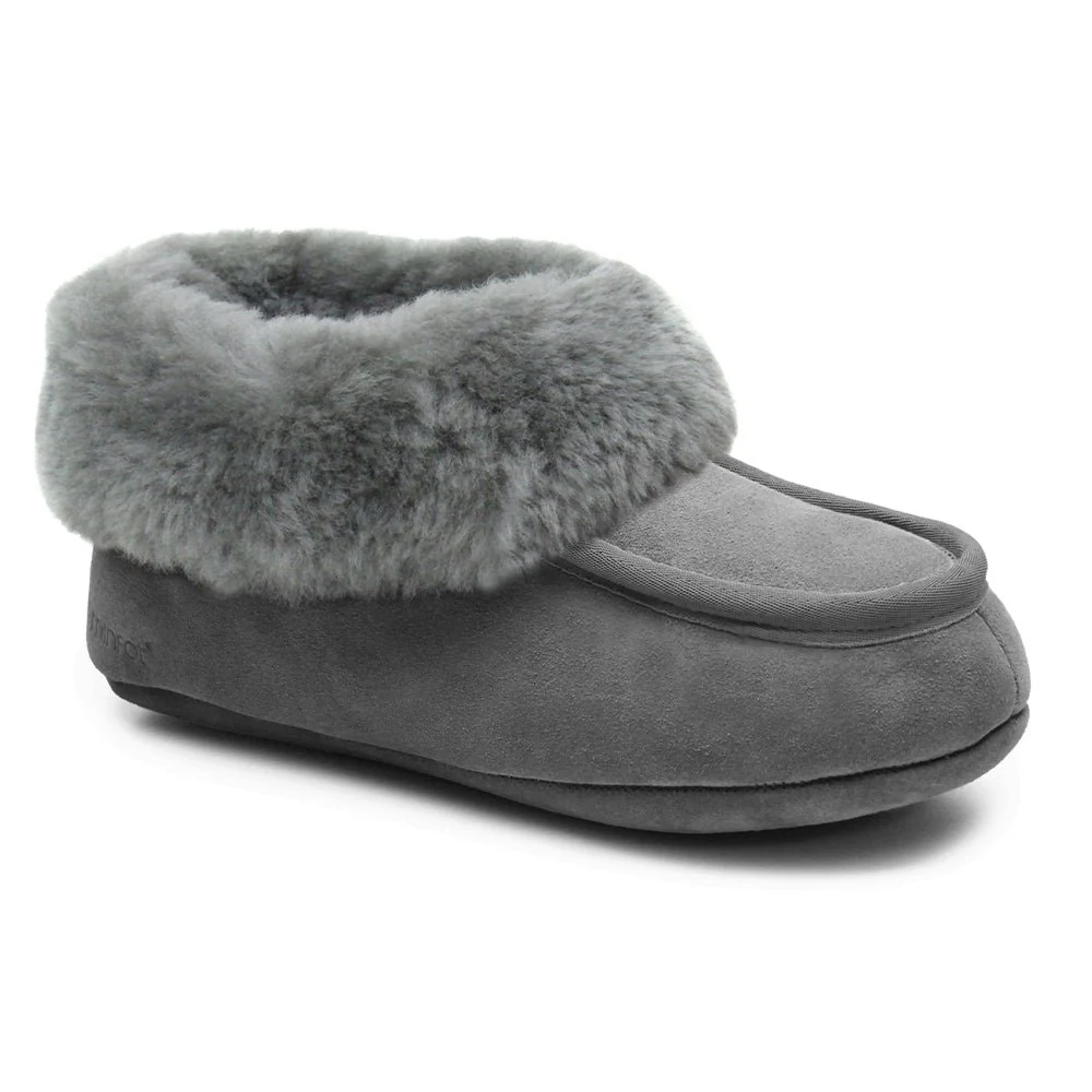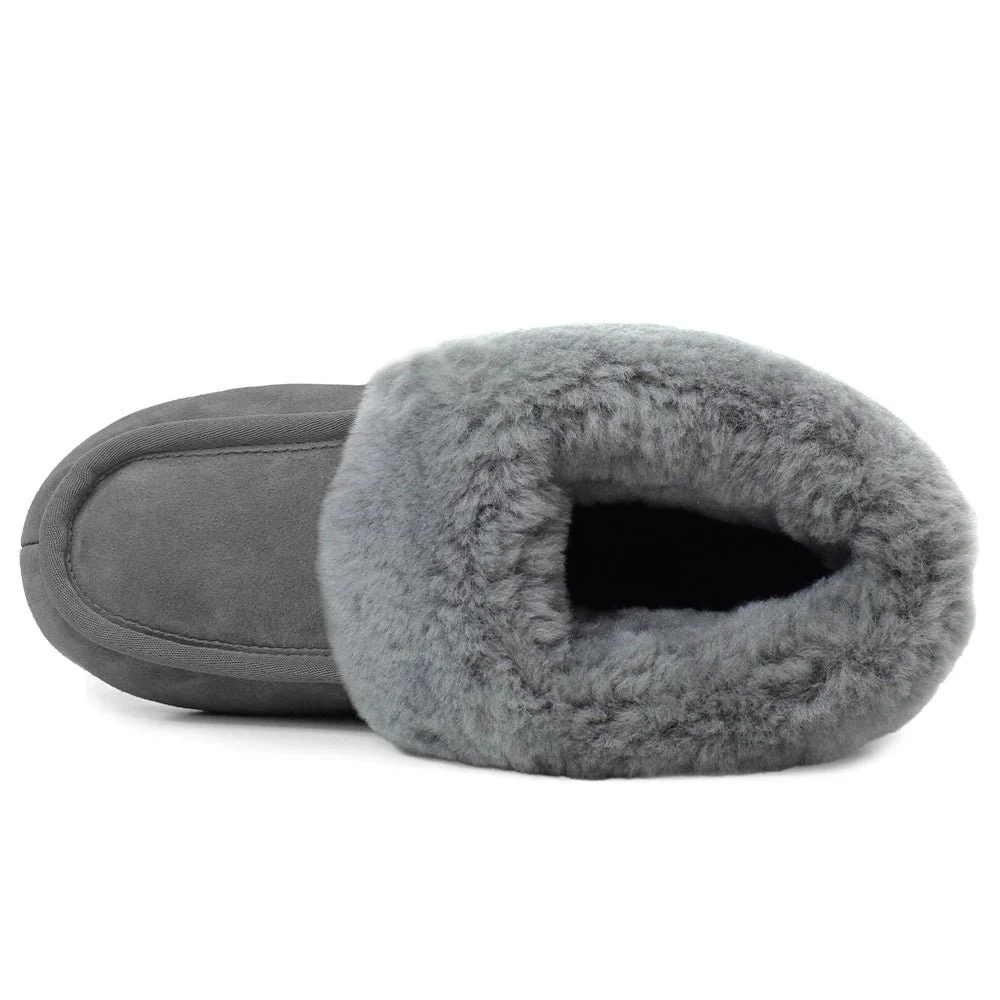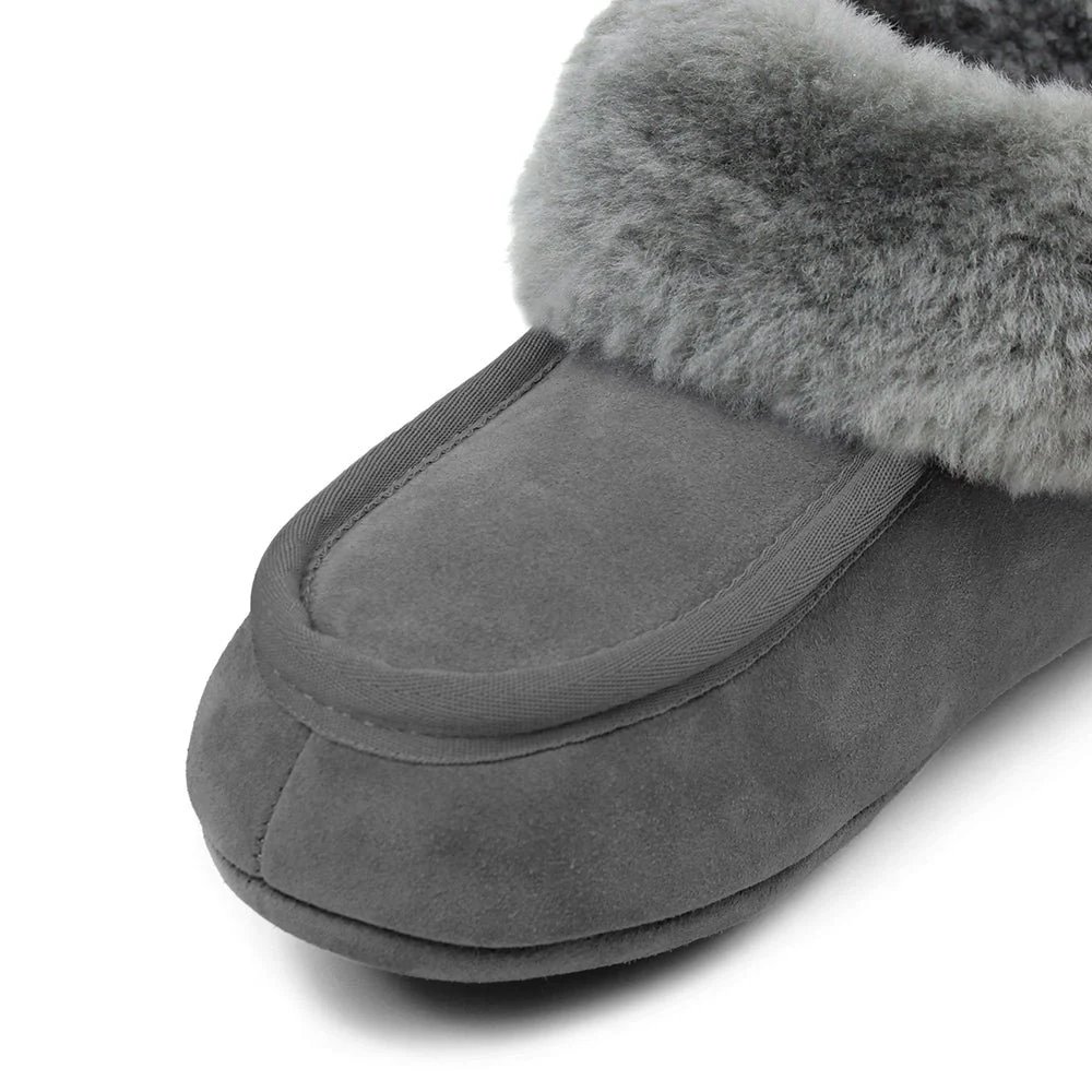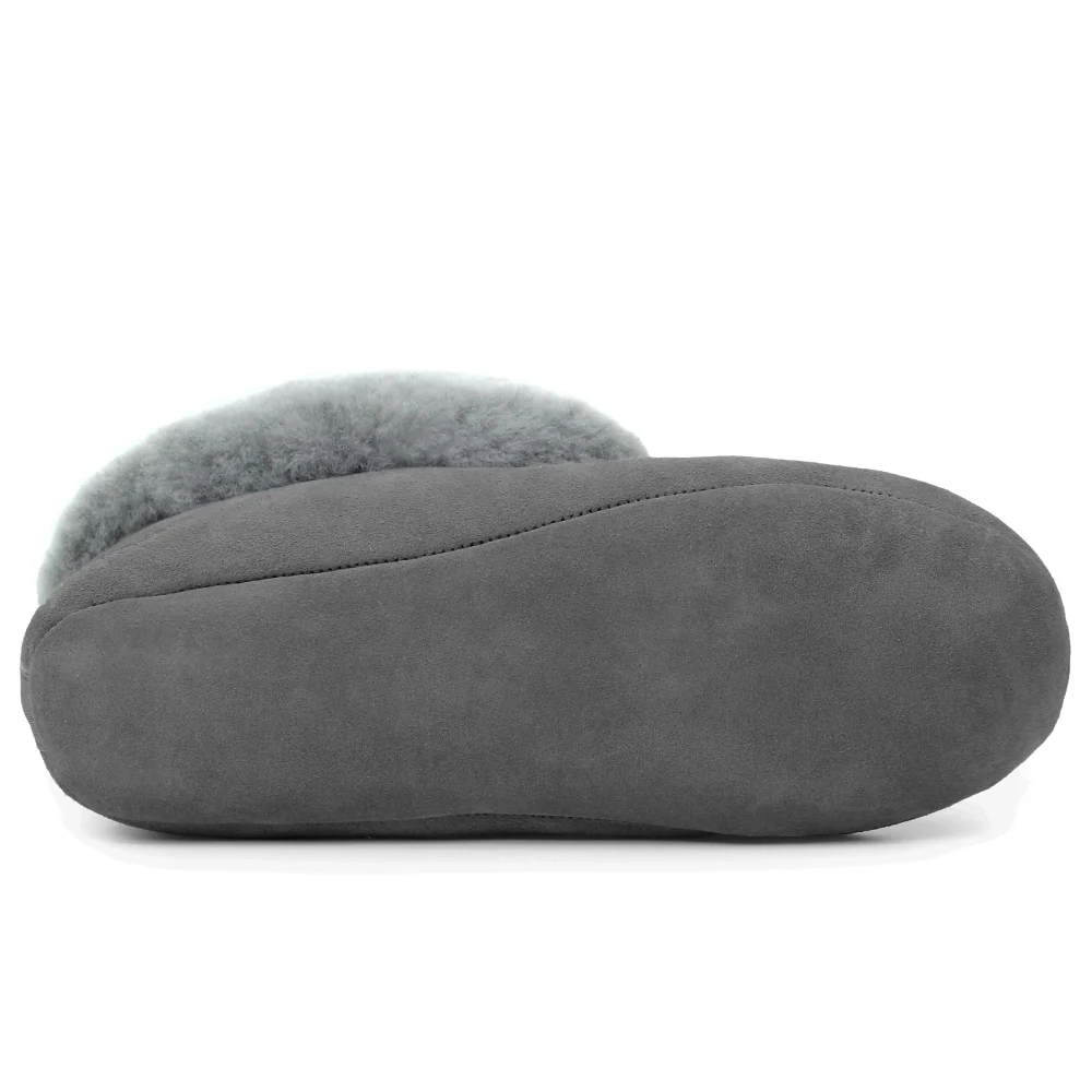 Fårskinnstofflor i ljust grå mocka med krage och foder av äkta fårskinn som håller dina fötter varma och sköna.
