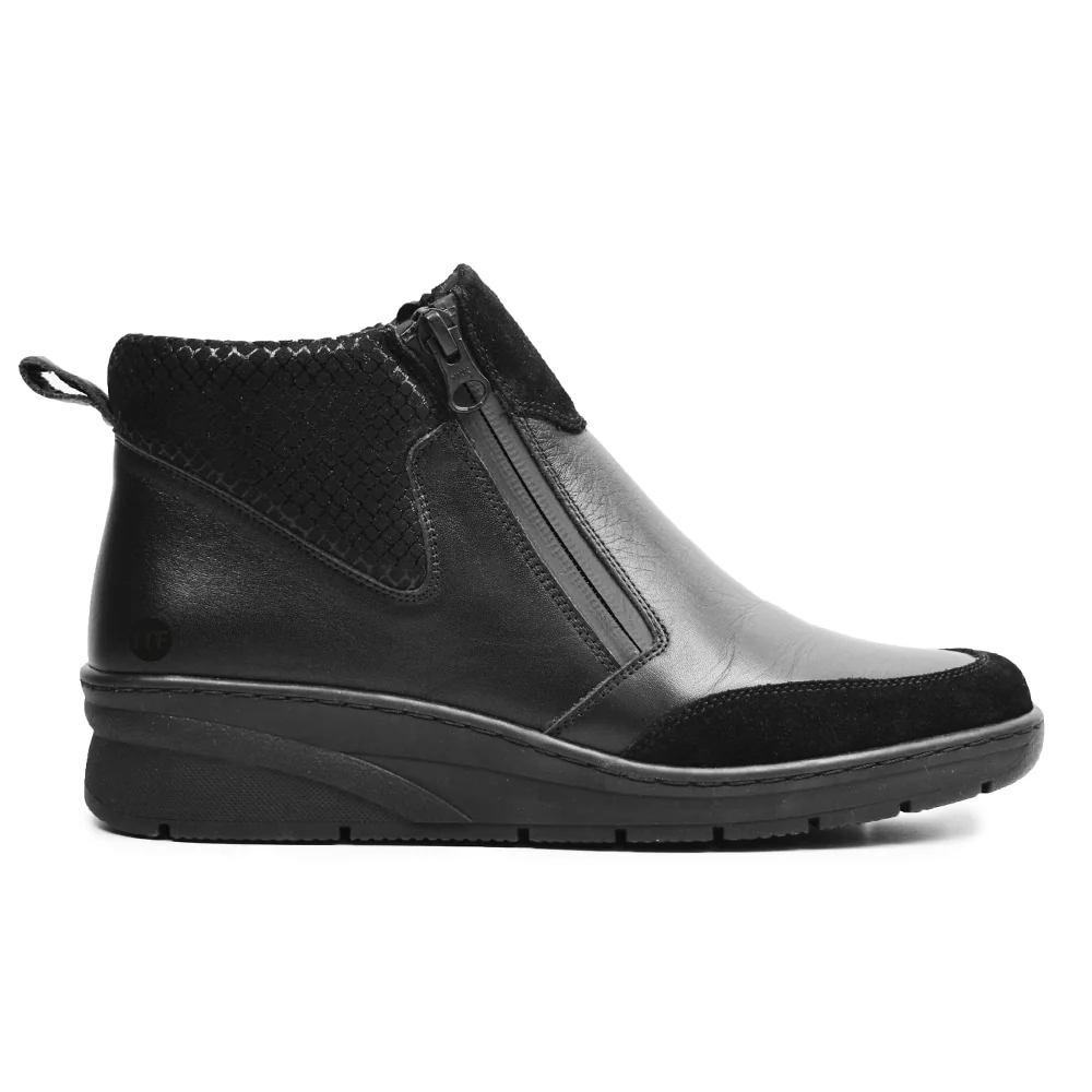 Svarta boots i läder med dubbla dragkedjor och vattenavvisande membran som står emot väta. Praktiska och bekväma höstskor för dam med ett kortare skaft med mjuk komfort och flexibilitet runt ankeln. Skorna har rymlig passform med ovandel i mjuk nappaläder med detaljer i mocka. Tåboxen har en lite fyrkantig form där tårna får gott om plats.