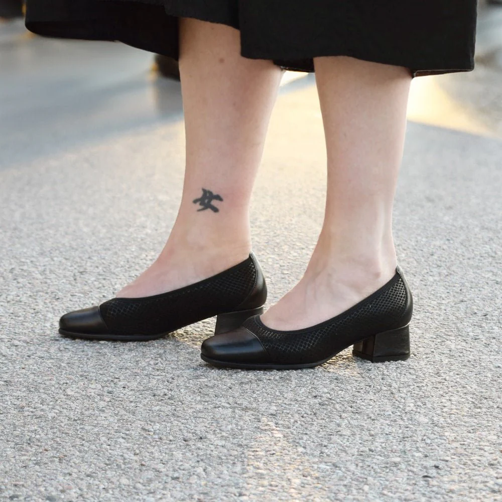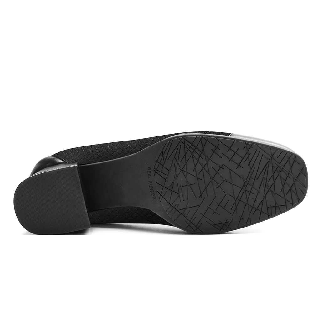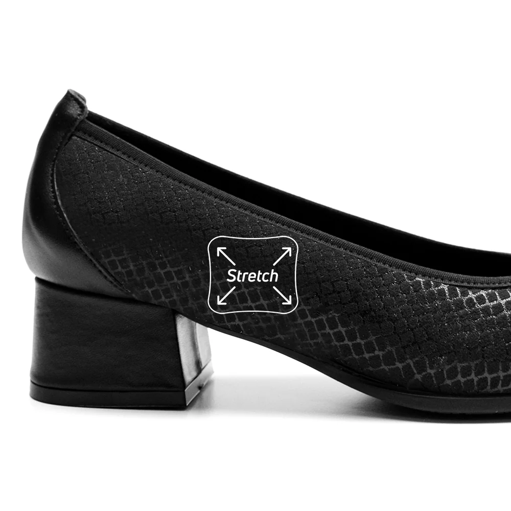 Svarta damskor med mönster ton-i-ton som ger det lilla extra till dessa festskor med komfort. Designen och komforten gör att de även passar fint som arbetsskor på kontoret.