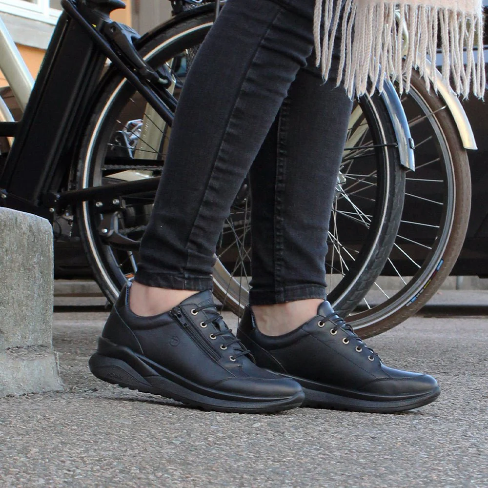 Damsneakers i svart skinn med vattenavvisande membran – både snygga och praktiska för vardag och promenader. Skorna kombinerar klassisk snörning med en smidig dragkedja på sidan, vilket gör dem enkla att ta av och på. Den lättviktiga yttersulan har stötdämpande egenskaper som ger skön avlastning vid varje steg.