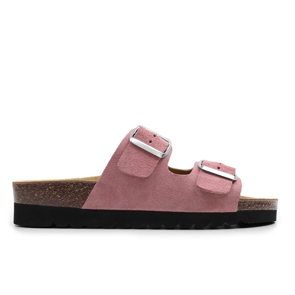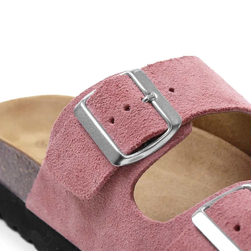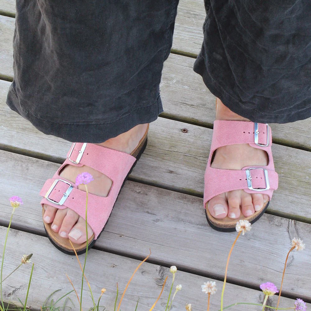 Rosa damsandaler i mjuk mocka med anatomisk fotbädd som ger avlastande stöd hela dagen. Den stabila korkfotbädden är har hålfotsstöd och tågrepp för optimal komfort och en naturlig fotposition. Den skålade hälen hjälper till att hålla foten stadigt på plats och ger extra stabilitet vid varje steg.