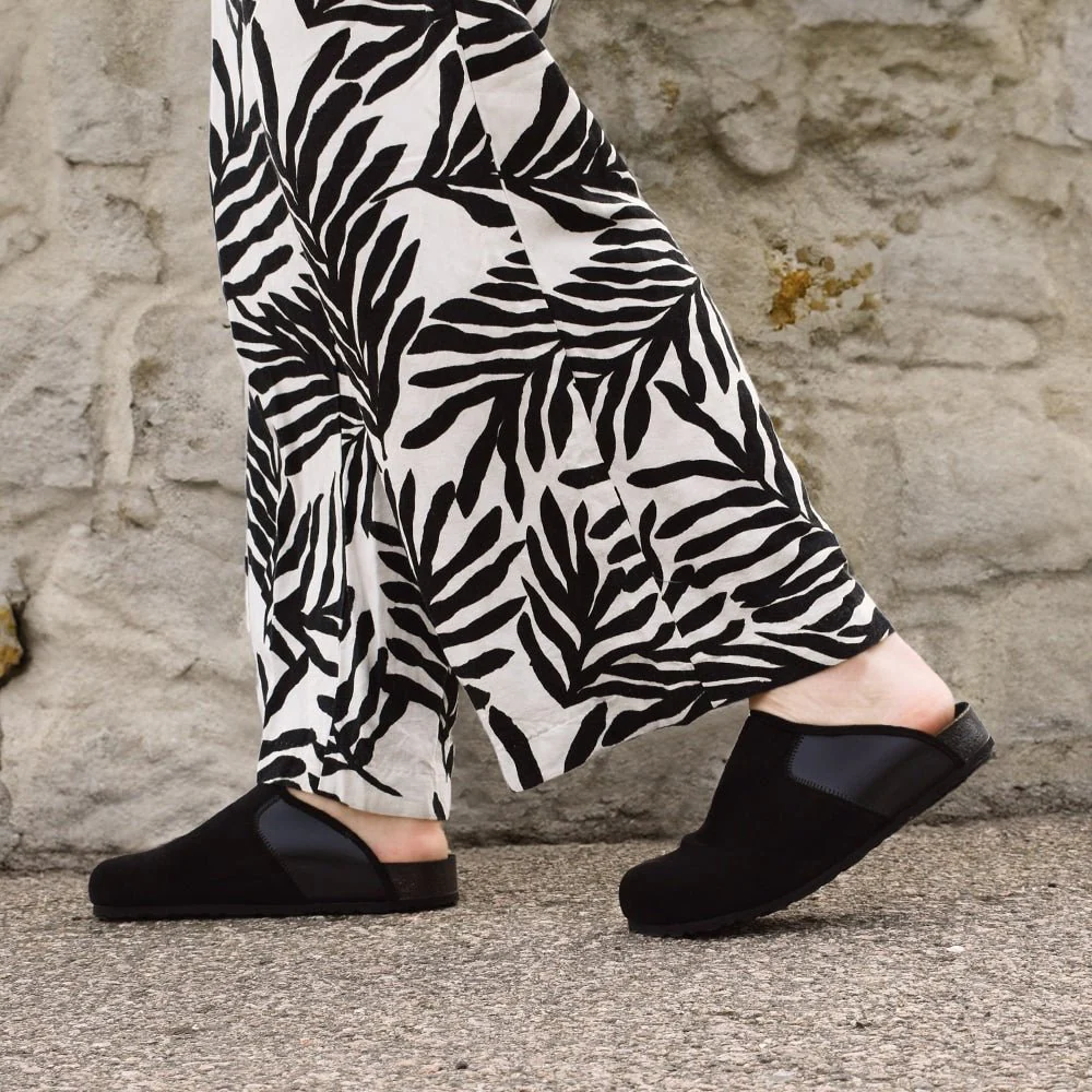 Flexibla och bekväma tofflor med överdel av mjukt mockaliknande textil med stretch med lycrafoder som passar knöliga, känsliga och ömma fötter eftersom de är följsamma och sitter bra på foten utan att klämma åt. Fotbädden i kork är klädd med mocka och ger mjukt stöd åt hela foten och har ett lätt hålfotsstöd.