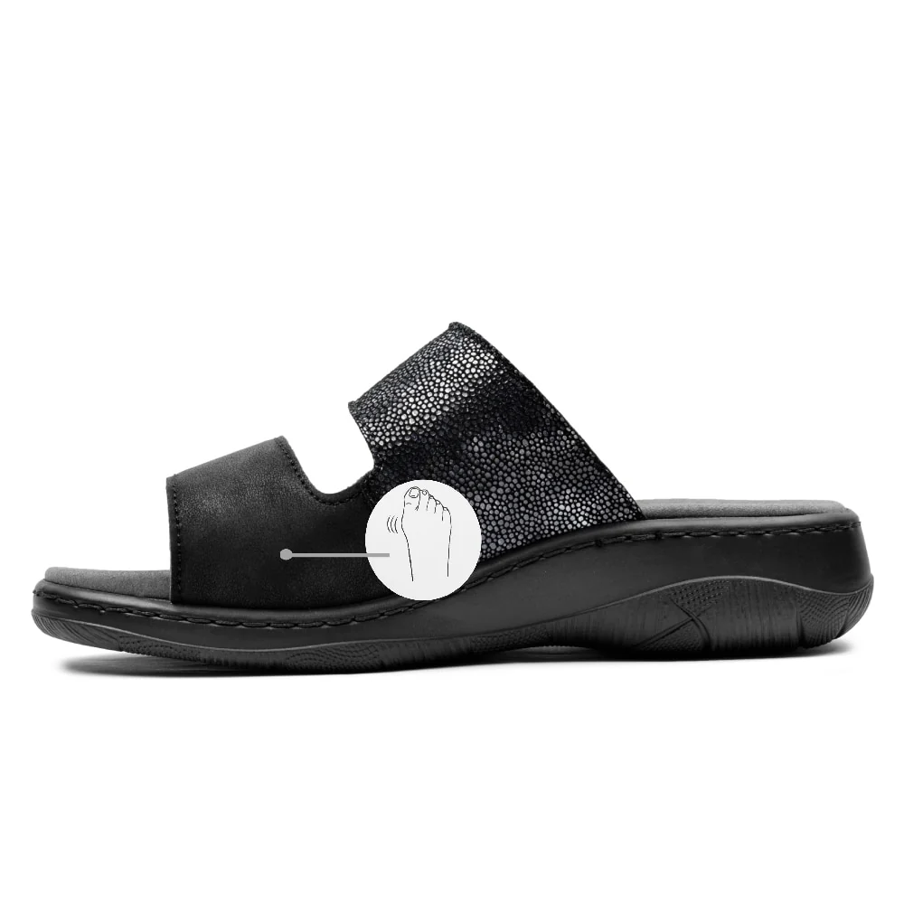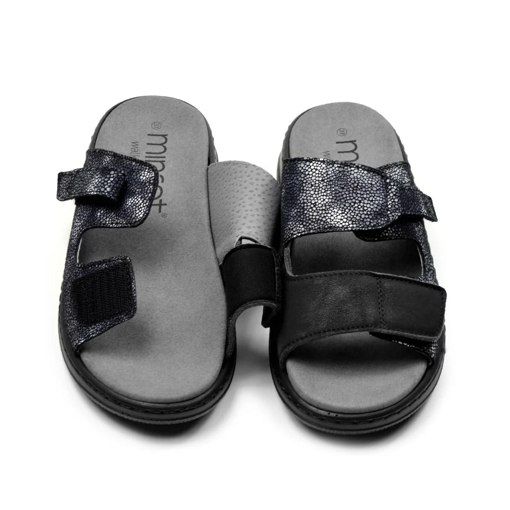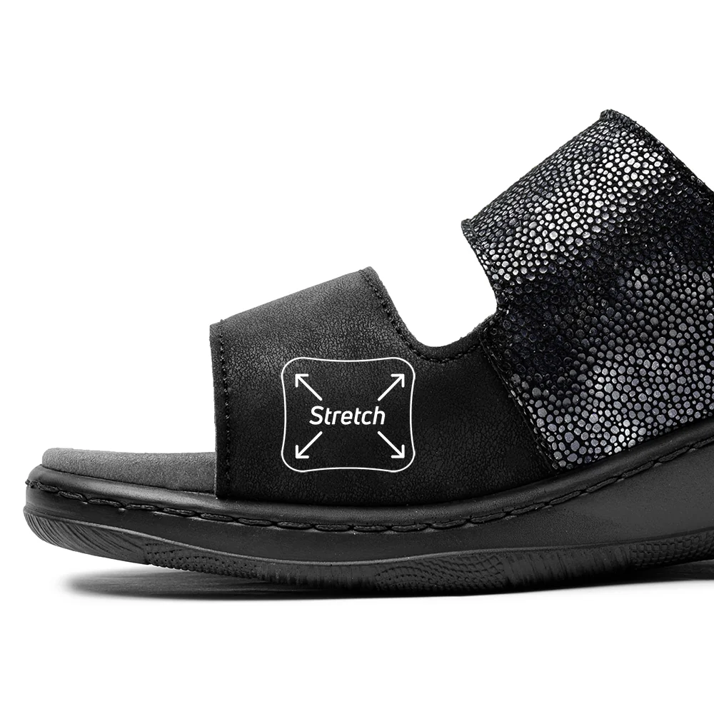 Bekväma sandaler med lätt hålfotsstöd och osynlig stretch i ovandelen som gör att de passar bra om man har hallux valgus eller bara lite knöliga fötter som behöver lite extra utrymme. Fotbädd med mjuk textil som ger bra stötdämpning och en yttersula av PU. Fotbädden är uttagbar om man vill lägga egna inlägg istället. Smidiga slip in-sandaler med fint mönster som passar för ömma fötter.