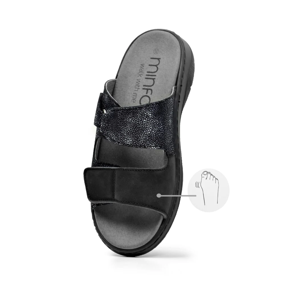 Sandaler med stretch i ovandelen från Minfot, passar extra bra för dig som har problem med hallux valgus. Två reglerbara remmar med kardborreknäppning och dekorativt mönster.