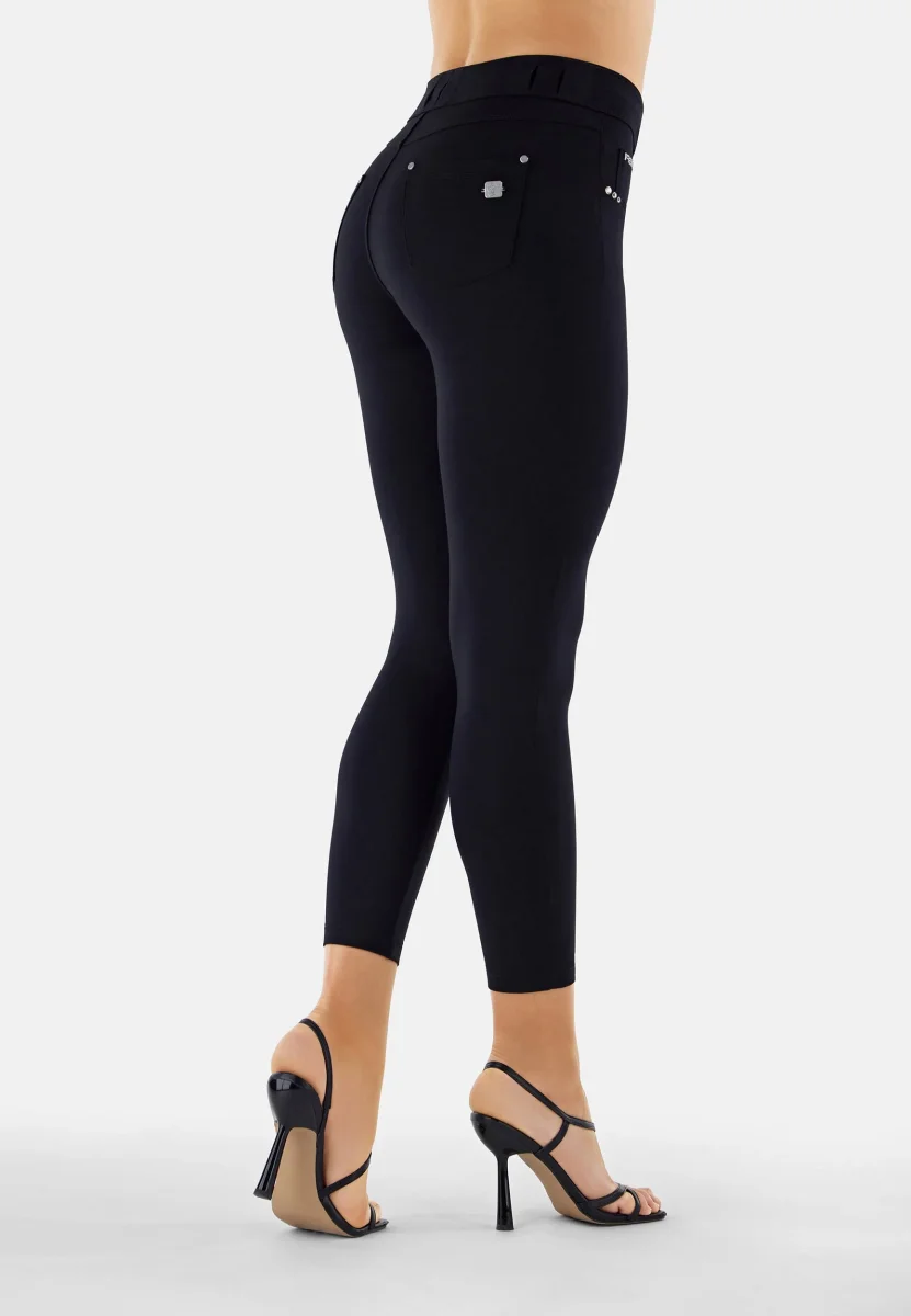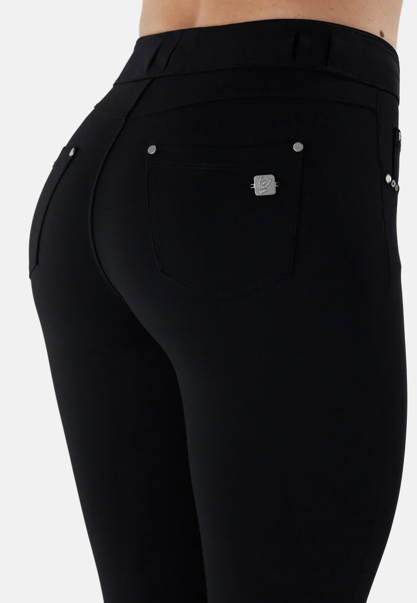 N.O.W.® D.I.W.O.® Pro redefines comfort without compromise. This true-to-size, high-waisted 7/8 length pant features our proprietary Emana® fabric—engineered with bioactive minerals that work with friction and UV rays to visibly reduce cellulite appearance and enhance skin firmness. The sleek silhouette mimics a traditional skinny leg trouser while delivering exceptional wearability. Real buttons, hidden belt loops, and five functional pockets complete the refined design. Black. 59% Polyamide, 41% Elastane.