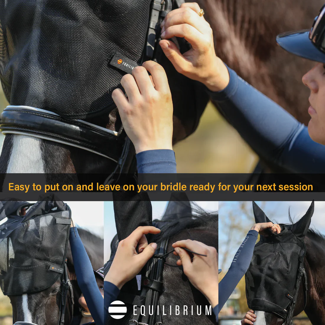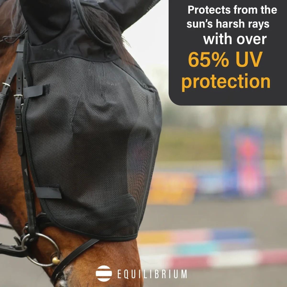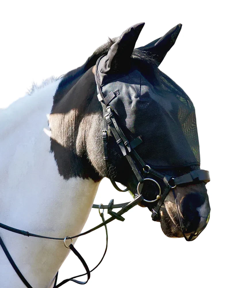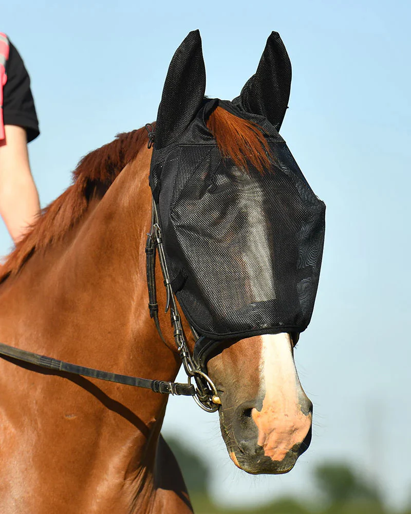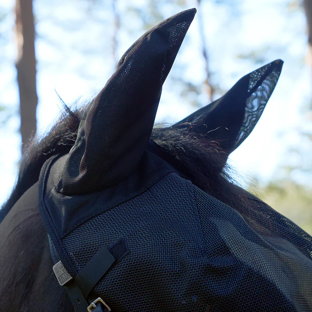 Ridmasken skyddar hästens ögon och öron mot UV-strålning, flugor och insekter under ridturen.