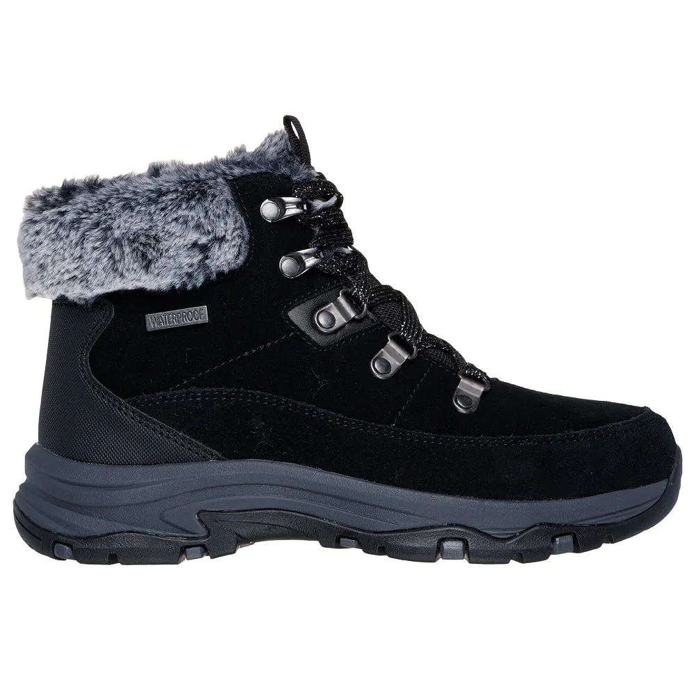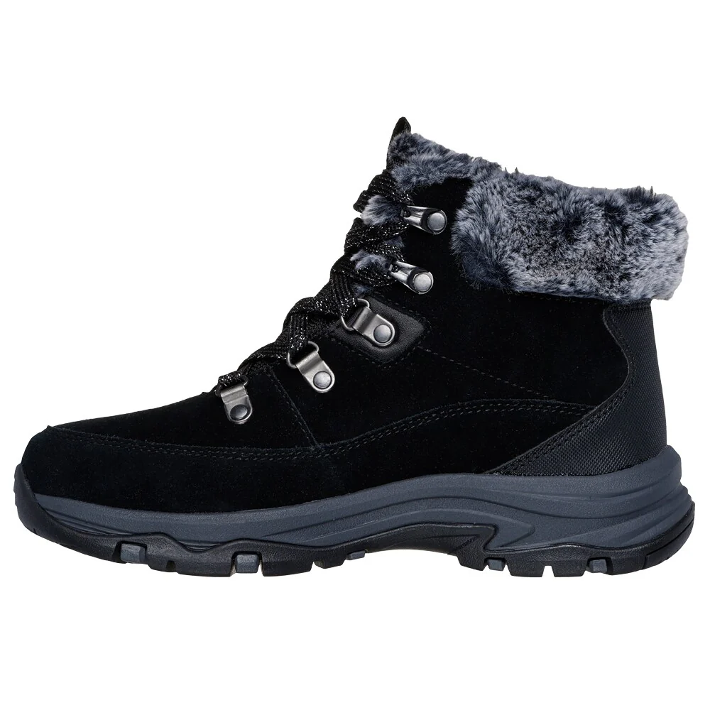 Sköna och vattentäta vinterkängor Skechers Trego Boots Black. Denna robusta promenadkänga är designad för att hålla dig varm, torr och bekväm under kyliga dagar, samtidigt som den ger ett feminint uttryck med sina glittrande skosnören och mjuka detaljer.