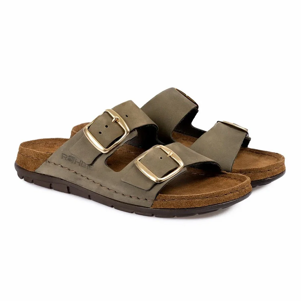 Rohde Damsandaler Rodigo Oliv med två remmar med ovandel av grönt läder och fotbädd med memory foam.