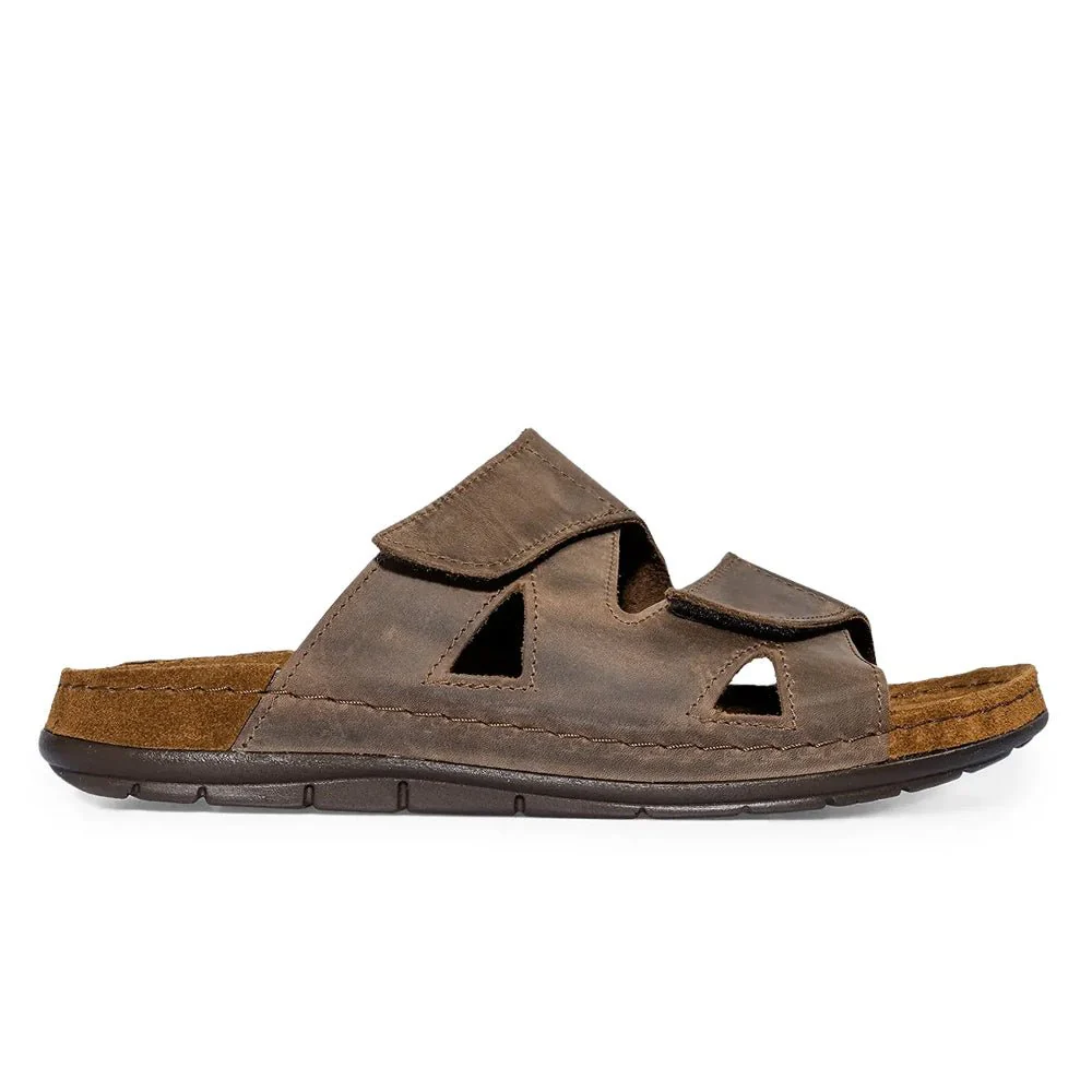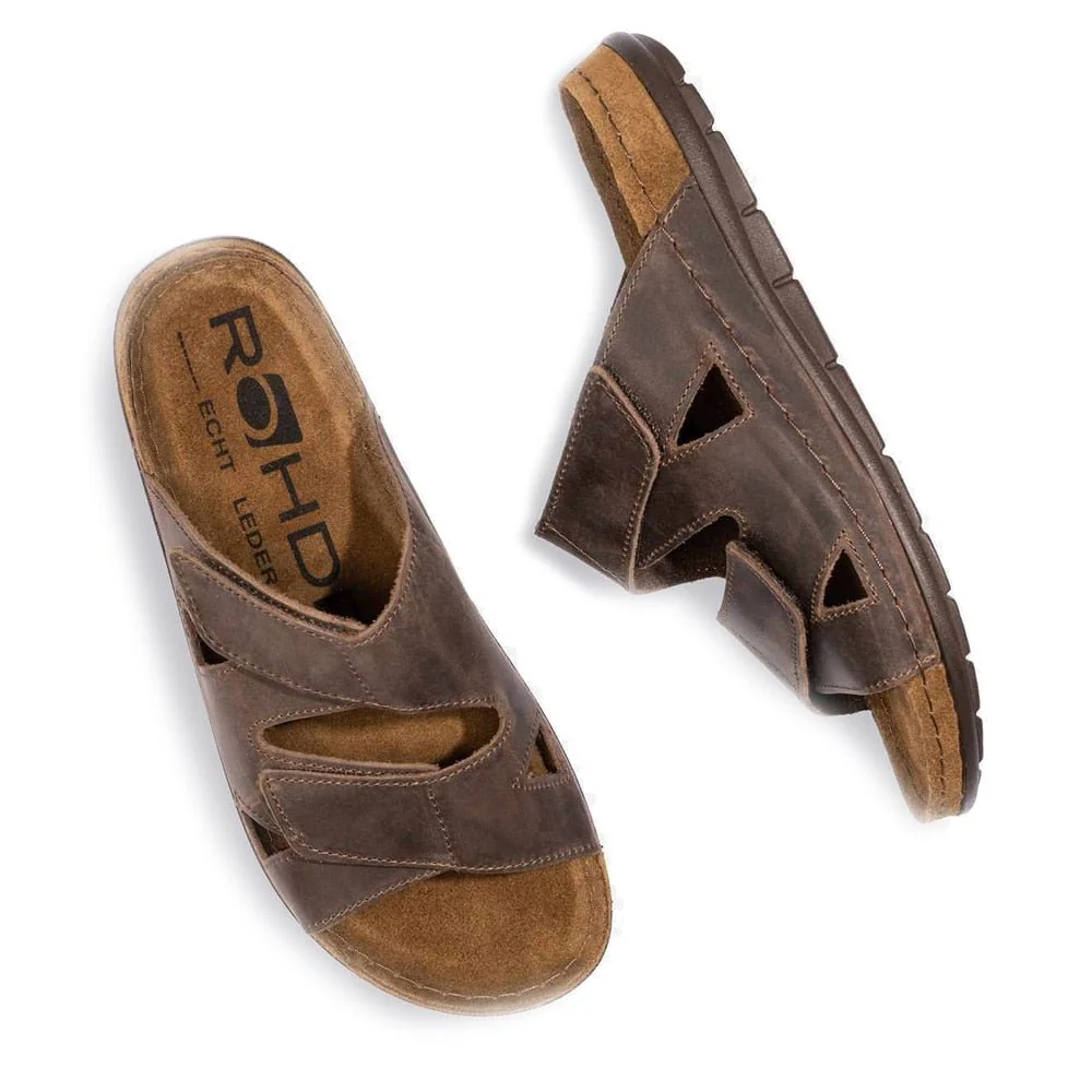 Rohde Cross bruna sandaler för herr i smidig slip on modell utan hälrem, med en ovandel i nappaläder som du enkelt kan justera med två kardborreremmar.