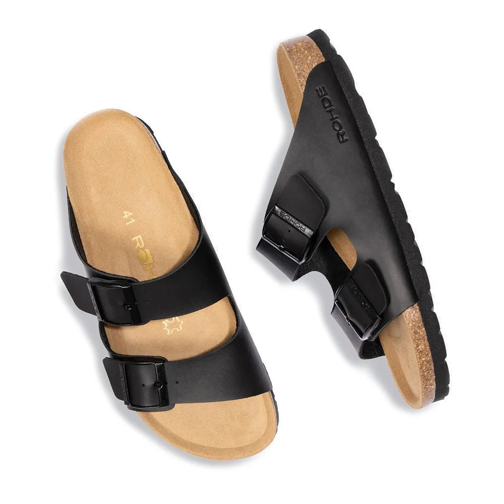Rohde svarta sandaler för herr i hudvänliga syntetmaterialet Birkoflor, designade för att ge dina fötter komfort och avlastning. Sandalernas fotbädd är anatomiskt utformad med täckyta i mocka. Den mjukstoppade fotbädden med dämpning, ger en skön och dämpande känsla när man både går och står mycket. Fotbädden är även designad med ett tågrepp och med ett hålfotsstöd som ger en behaglig bas för foten och en avlastande funktion.