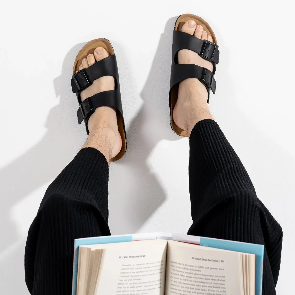 Sandalernas ovandel har två remmar som du kan justera för bästa passform med hjälp av två spännen. Klassiska och fotriktiga korksandaler som kan användas som bekväma inneskor eller arbetsskor.