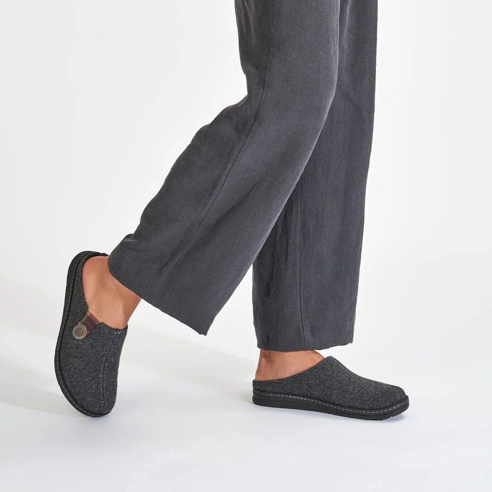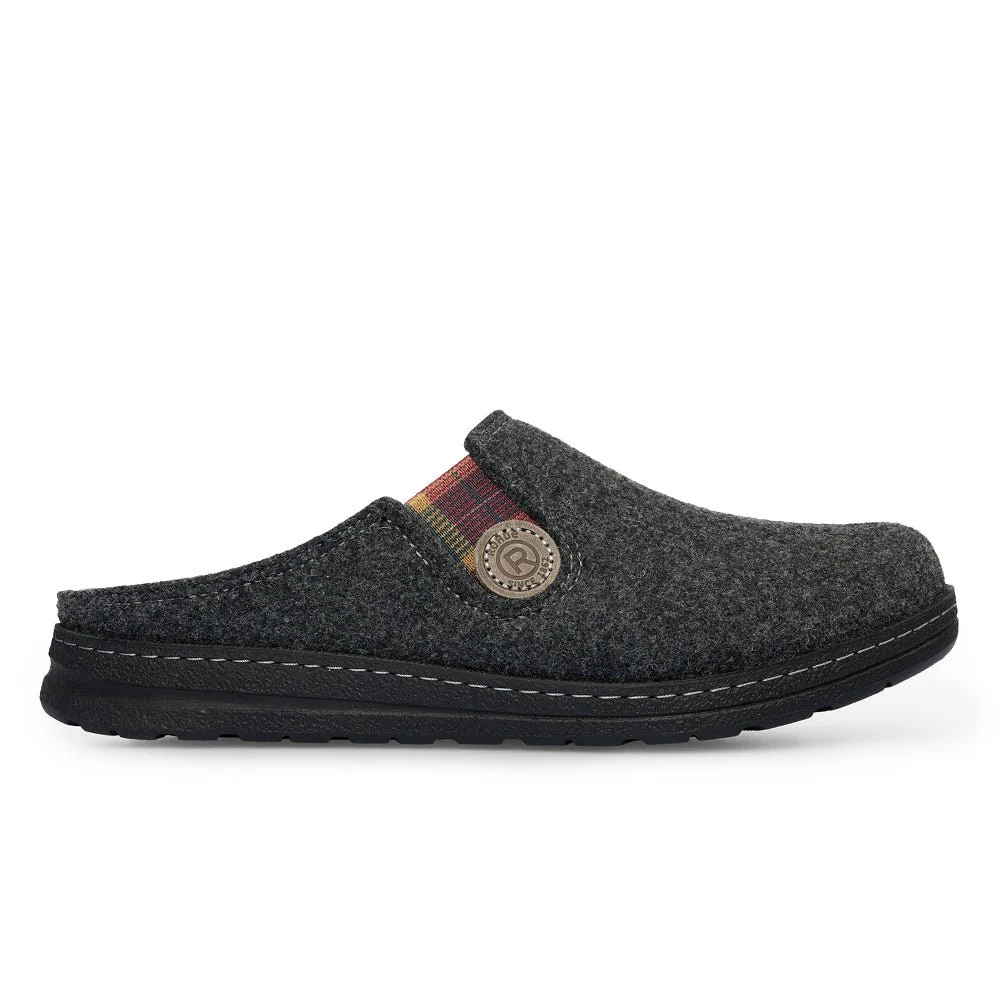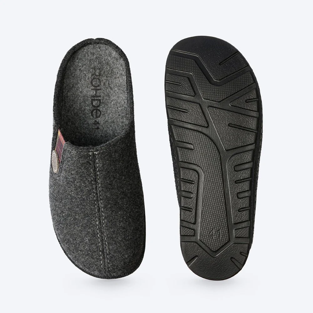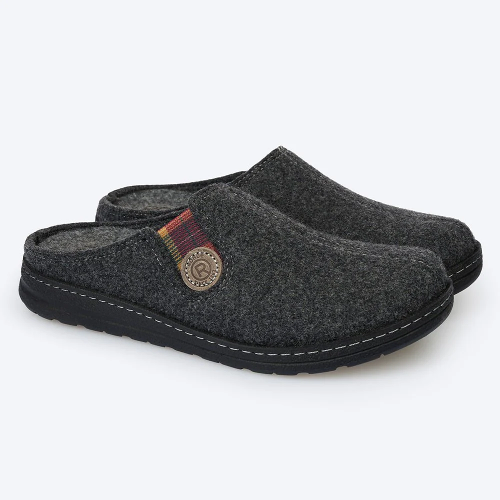 Herrtofflor Rhode Asiago i antracitgrå filt i ovandelen och med stabil yttersula i PU. Tofflorna har uttagbar fotbädd om man behöver byta mot egna inlägg.