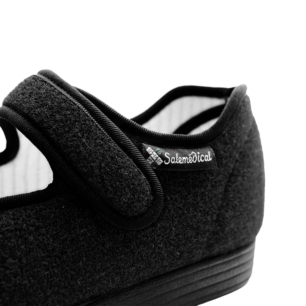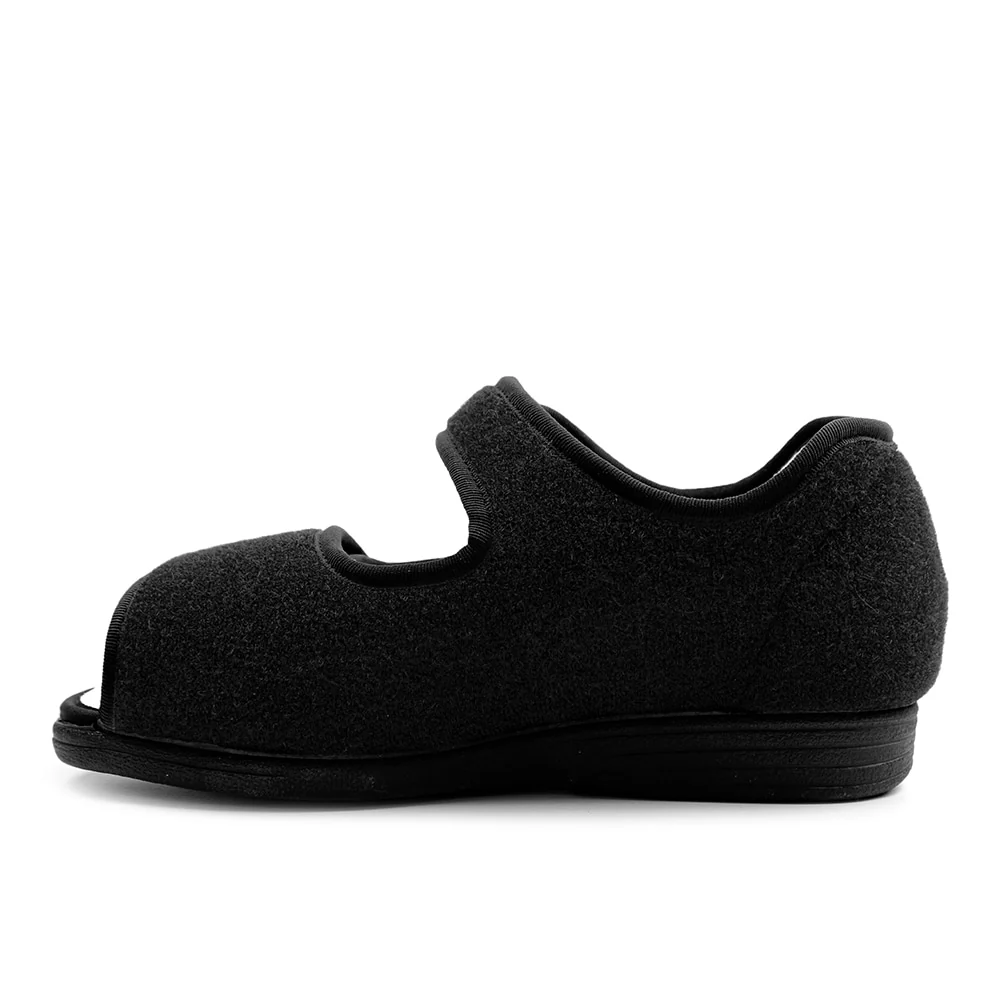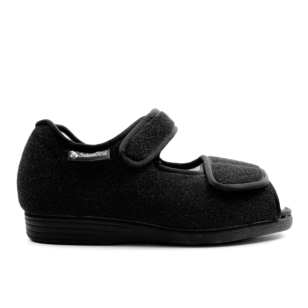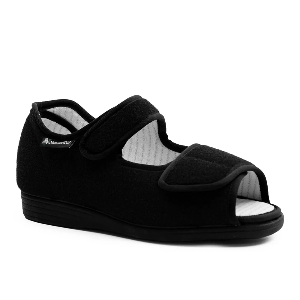 Mjuka specialskor med öppen tå och två remmar med kardborreknäppning, lätta att ta på och av.