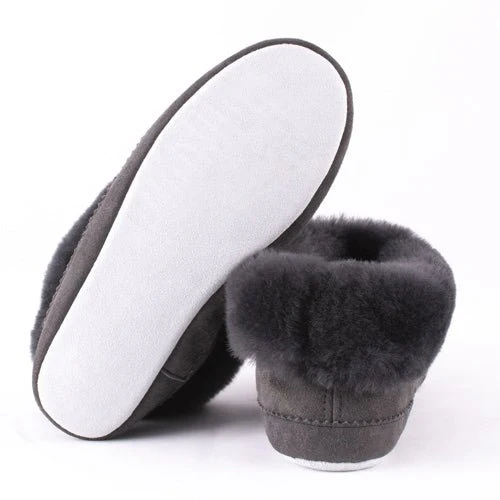 Grå fårskinnstofflor Emmy från Shepherd of Sweden är tofflor i 100% fårskinn med yttersula av läder. Mjuk ovandel med avslappnad passform där man lätt sticker ner foten.