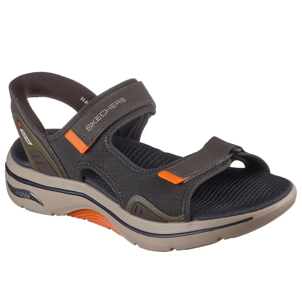 Skechers olivgröna sandaler Go Walk för herrar kombinerar enkel påtagning med maximal komfort. Sandalerna har Slip-Ins hälkappa för hands-free användning, samt Arch Fit inbyggt hålfotsstöd som formar sig efter foten. Två justerbara kardborreremmar över foten ger möjlighet till optimal passform, och hälremmen med slip-on funktion gör det enkelt att ta på sig sandalerna. Slip-Ins gör att man kan trycka i foten utan att man behöver böja sig ner.