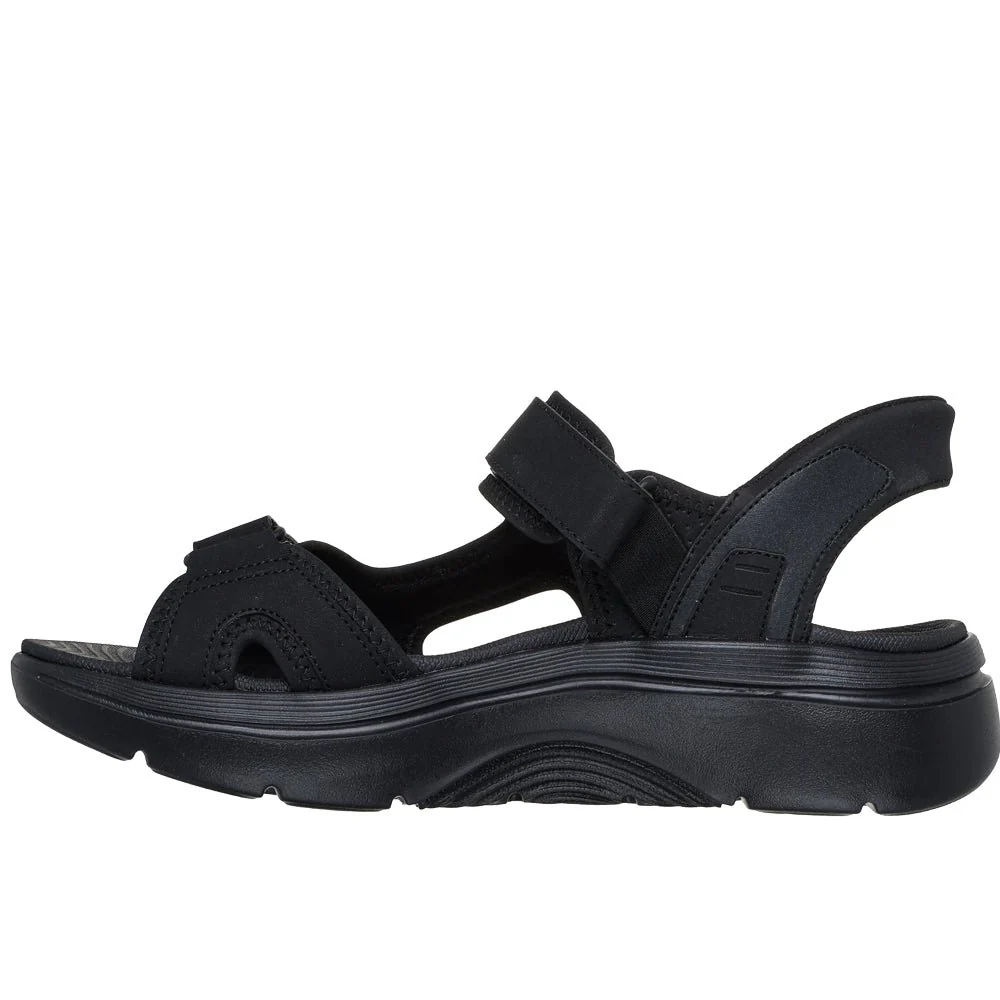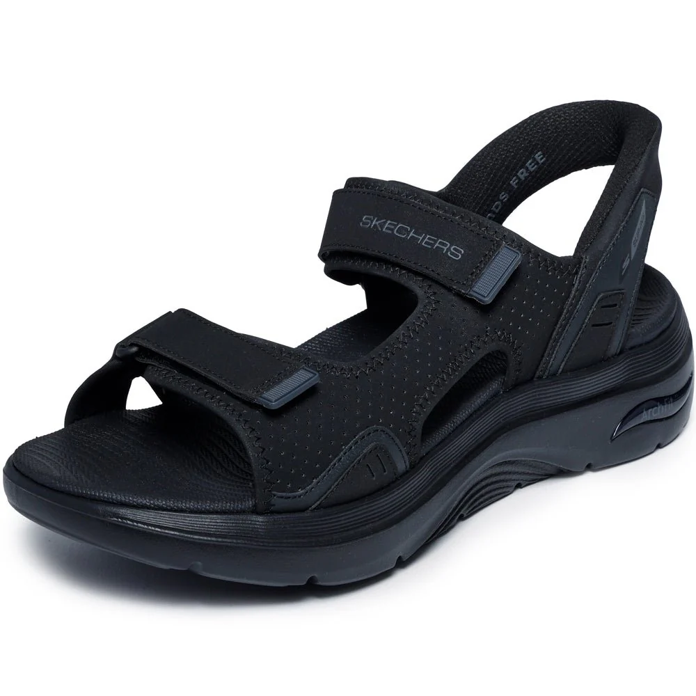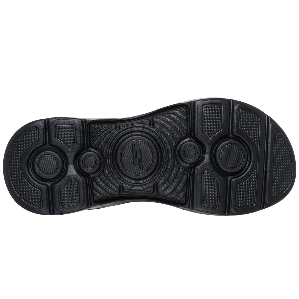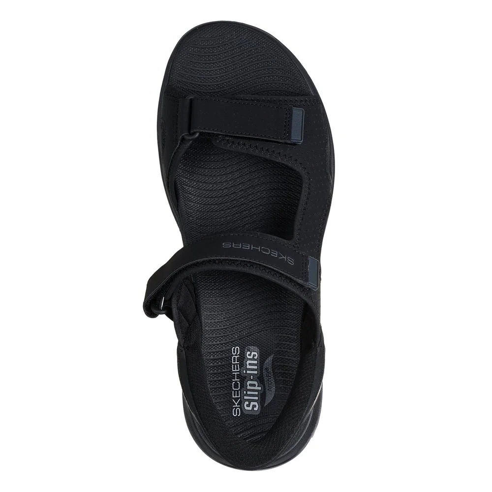 Skechers svarta sandaler Go Walk för herrar har både Slip-Ins hälkappa för enkel påtgagning samt Arch Fit inbyggda hålfotsstöd. Fotriktiga herrsandaler med hands-free design där man kan trycka ner foten utan att använda händerna. Sandalerna har två justerbara kardborreremmar över foten för bästa passform. Hälremmen har slip-on funktion så att man lätt kan ta på sig sandalerna.
