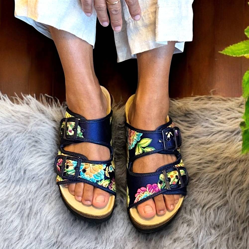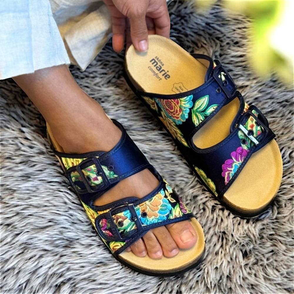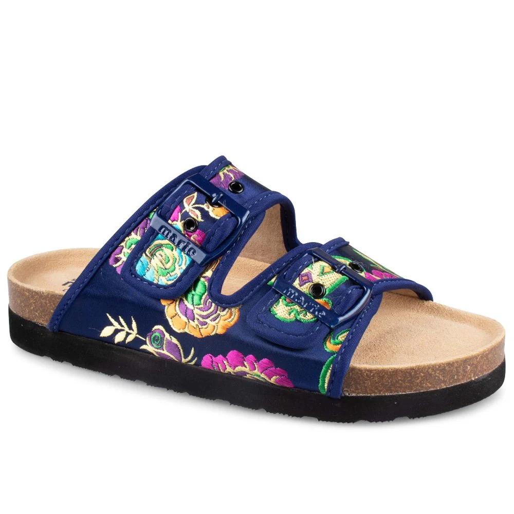 Sköna Marie Thalia är damsandaler med ovandel som är broderad med blommönster på blå botten, två reglerbara remmar och bred läst.
