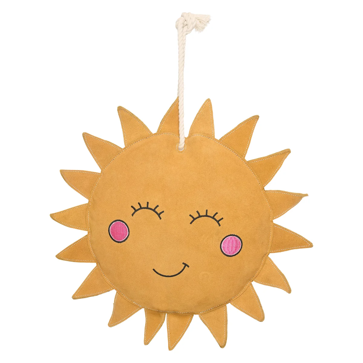 Mjuk gullig sol i mocka med fyllning av polyesterfiber. Kan tex hängas med det medföljande repet i boxen.