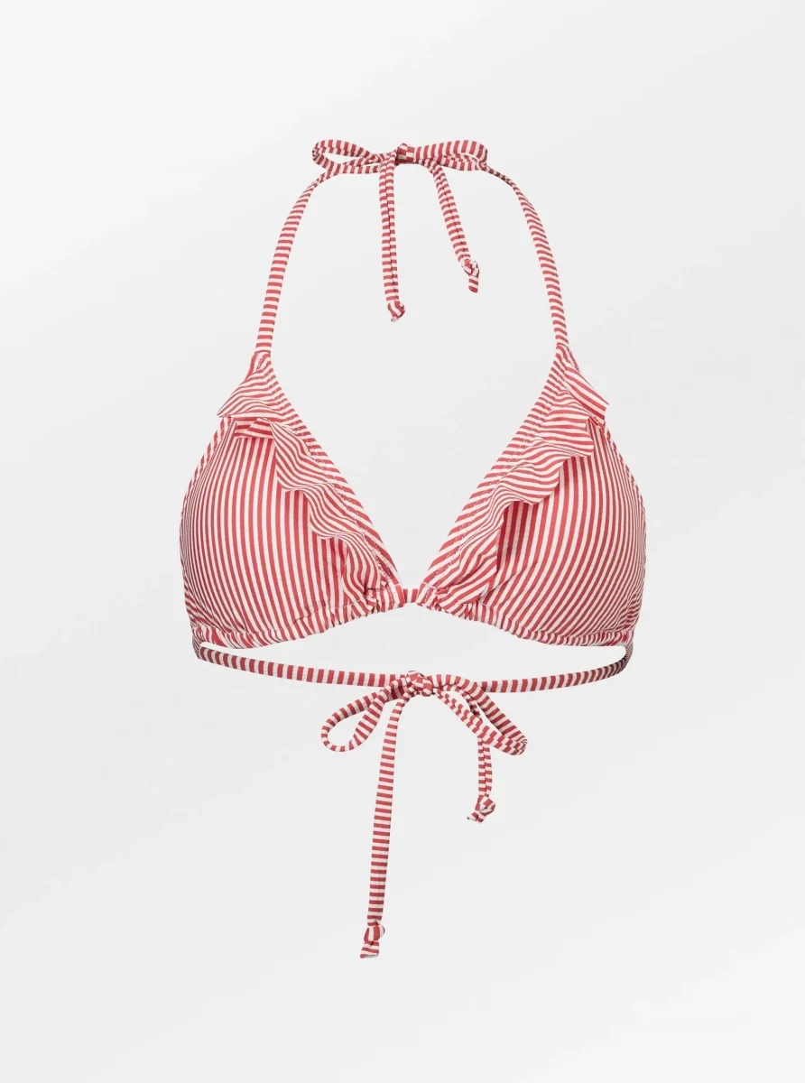 Striba Bel Frill Bikini is a striped bikini top with fringes, adjustable with ties at the neck and back.