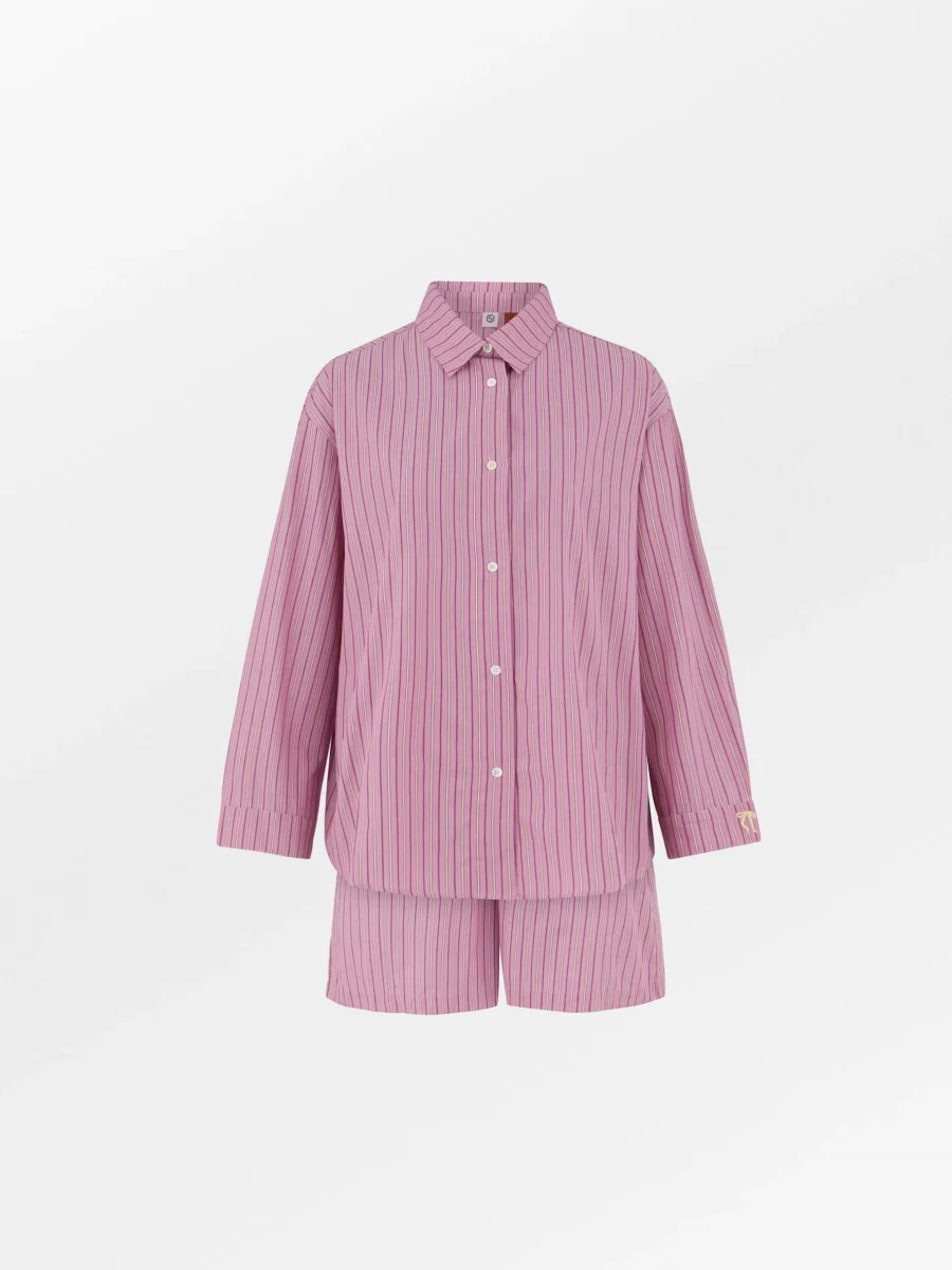 The Stripel Pyjamas Set, designed by Becksöndergaard, is a stylish pyjama set made from 100% organic cotton. The set consists of a nightshirt and shorts with elegant stripes, giving it a classic and feminine look. The shirt features buttons all the way down, while the shorts are equipped with a comfortable tie waist. With the Stripel Pyjamas Set, you get both comfort and style, perfect for relaxation. Available in several colors. We recommend washing the set at a maximum of 40 degrees and avoiding tumble drying.