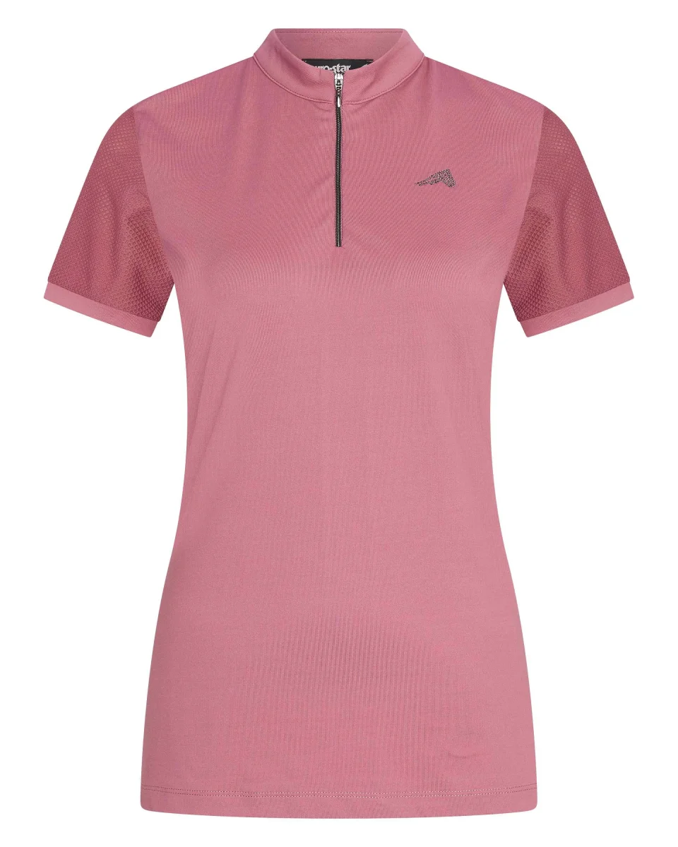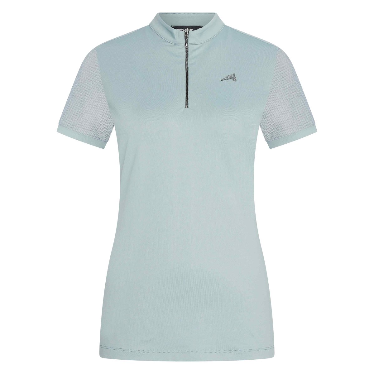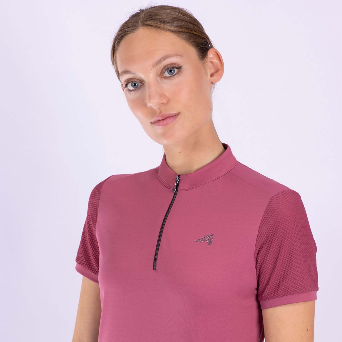 Underbart skön ridtopp i ett snabbtorkande material. Figursydd och med dragkedja i halsen. Hästhuvud i Rhinestones på bröstet.