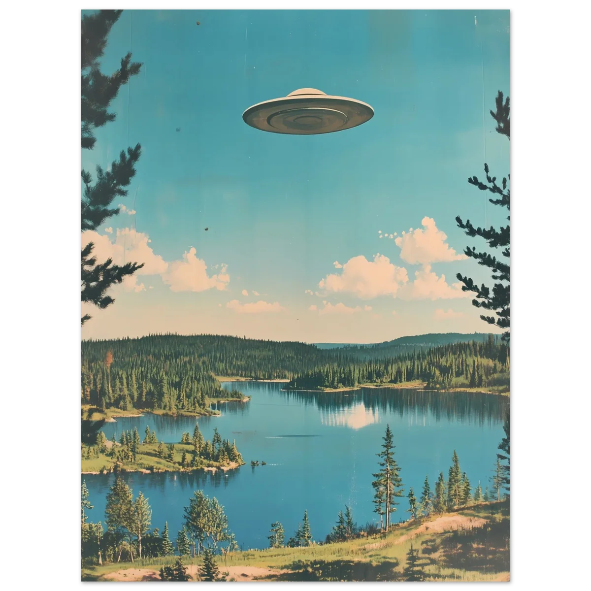 Föreställ dig en stilla dag i den svenska vildmarken, när plötsligt något överraskande bryter tystnaden. Denna poster fångar en magisk blandning av den orörda naturen och mysteriet kring UFO-fenomenet. Ett svävande rymdskepp ovanför en spegelblank sjö och omgivande skog ger en känsla av både ro och nyfikenhet. Perfekt för alla som älskar både naturen och mysterier, och vill ha ett konstverk som väcker tankar och fantasi.