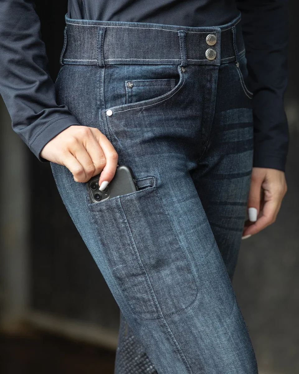 Equetech Denim Breeches är designade för att kännas som dina favoritjeans! Hög midja och med en praktisk ficka för smarphone på låret.